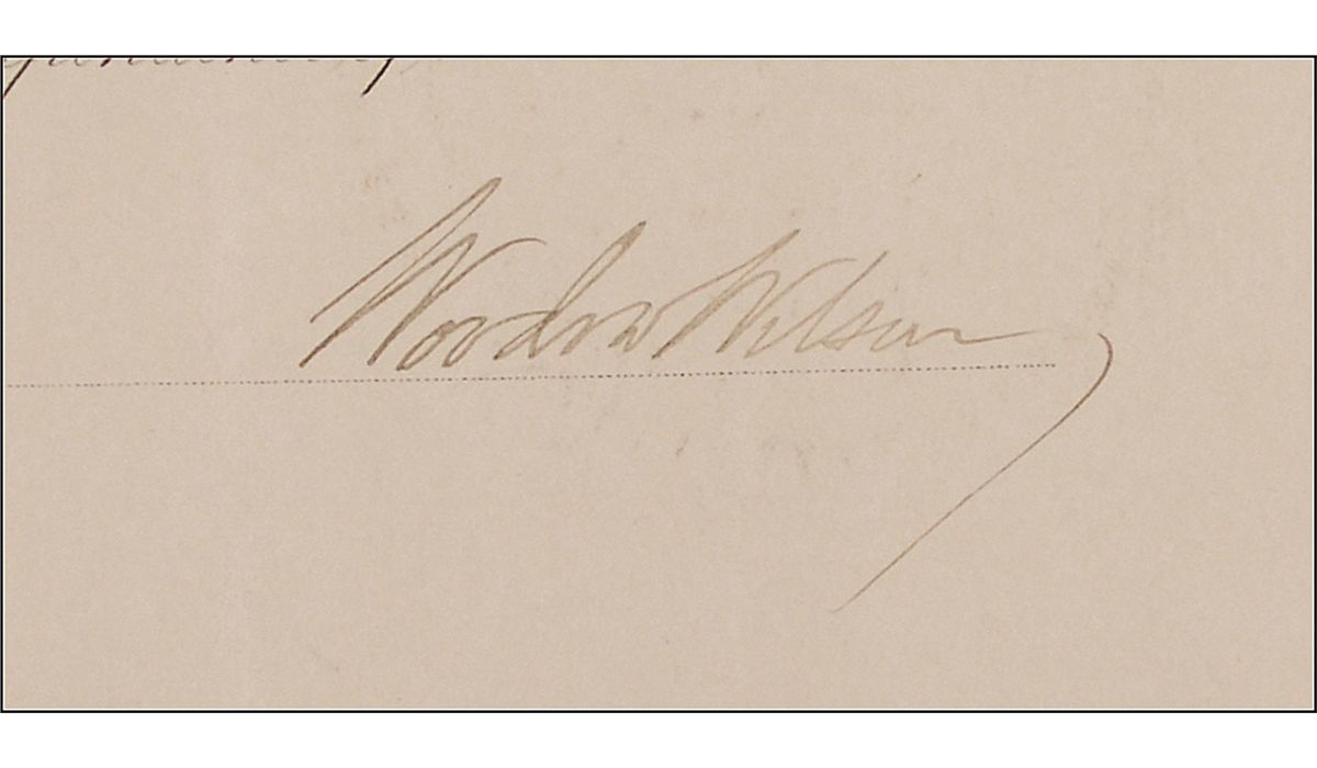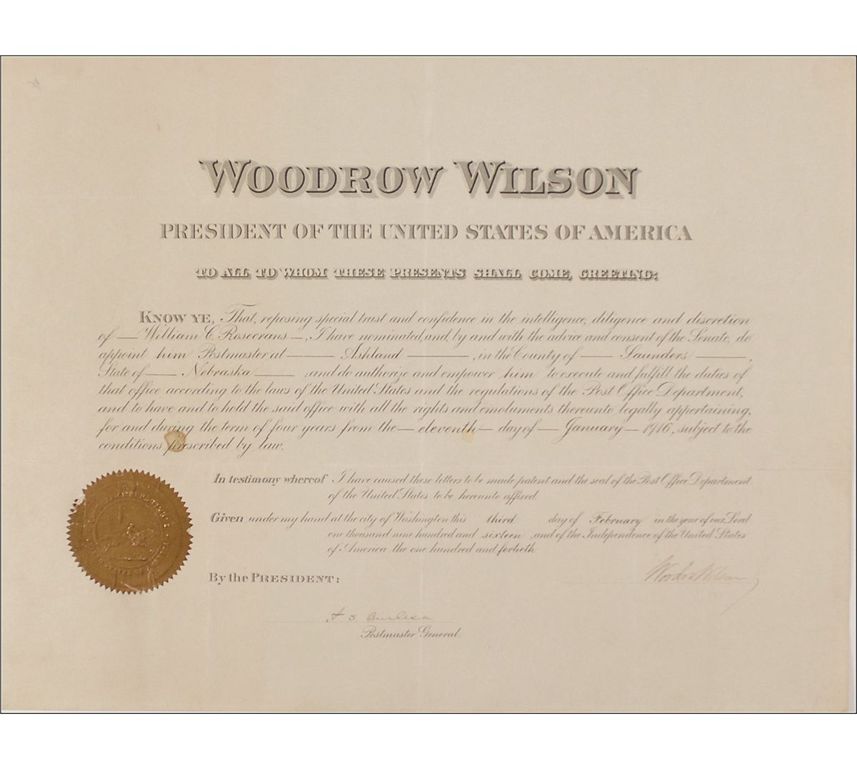 DS as president, one page, 18 x 14, February 3, 1916. President Wilson appoints William C. Rosecrans as Postmaster of Ashland, Nebraska. Signed at the conclusion by Wilson and countersigned by Postmaster General Albert S. Burton. A large gold Post Office Department seal is affixed to the lower left. In very good condition, with intersecting folds, a few spots of soiling, light uniform shade of toning, stray pencil mark to upper left, and light mirroring of the seal over the signature.