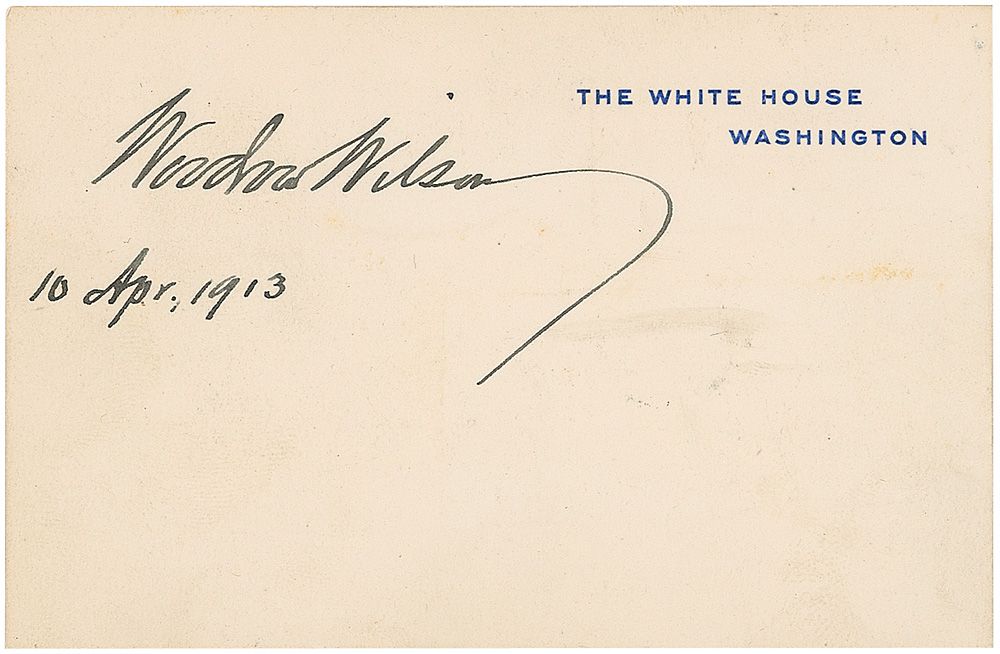 White House card, signed in the upper left in black ink, “Woodrow Wilson, 10 Apr. 1913.” Scattered soiling to front and mounting remnants to reverse, otherwise fine condition.