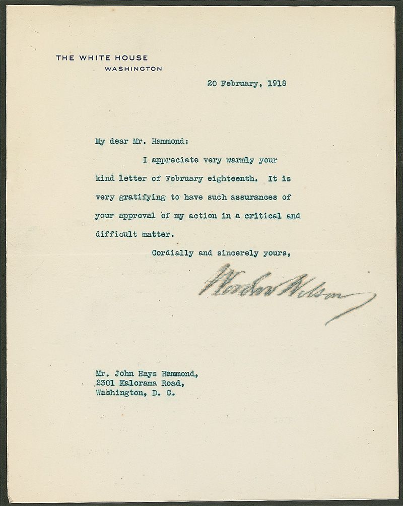 TLS as president, one page, 7 x 9, White House letterhead, February 20, 1918. Letter to John Hays Hammond. In full: “I appreciate very warmly your kind letter of February eighteenth. It is very gratifying to have such assurances of your approval of my action in a critical and difficult matter." Letter is affixed to a slightly larger black sheet. In very good condition, with a few wrinkles and ripples and moderate overall feathering to signature. Wilson had delivered his Fourteen Points speech to Congress the month before writing this letter and was working to establish the League of Nations.
