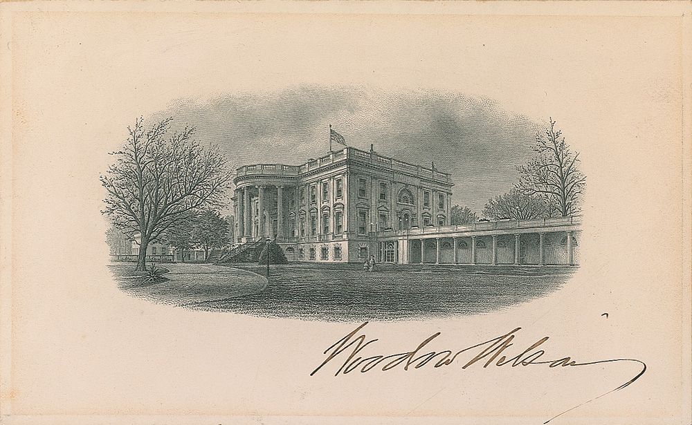 Uncommon and nicely detailed engraved portrait of the exterior of the White House, 6.5 x 4, signed along the bottom in black ink, “Woodrow Wilson.” In fine condition, with an overall shade of toning from previous display.