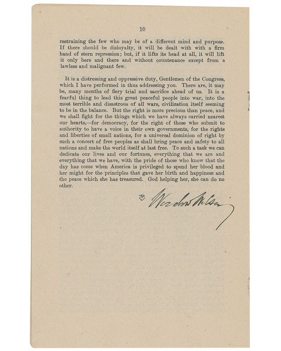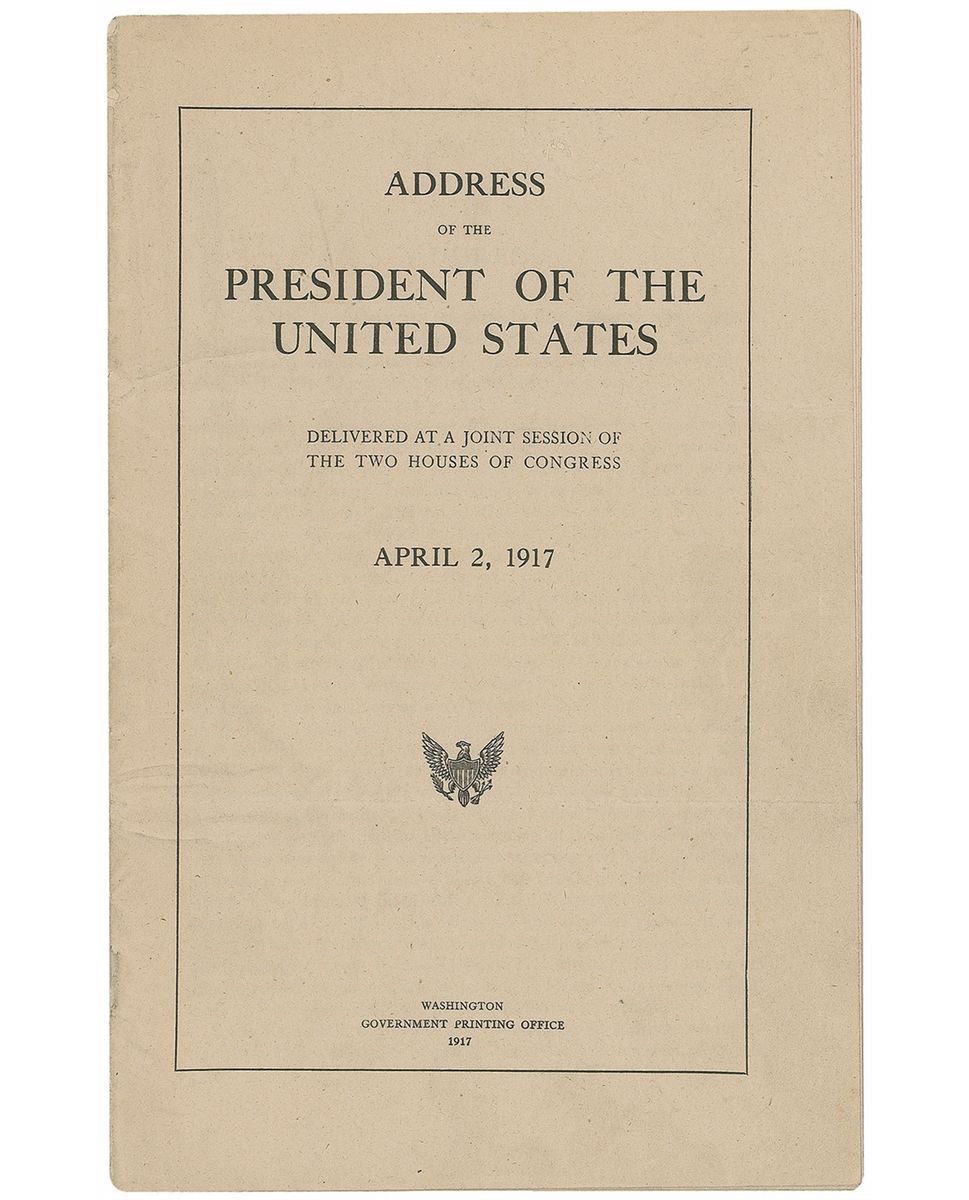 Printed speech in booklet form, “Address of the President of the United States, Delivered at a Joint Session of the Two Houses of Congress, April 2, 1917,” 6 x 9, ten pages, issued by the Government Printing Office. Historic speech in which Wilson asks the US Congress for a declaration of war on Germany. Signed at the conclusion in black ink by Wilson. In very good condition, with two horizontal folds, scattered creases, a couple areas of paper loss to back cover, as well as some mounting remnants and some mild soiling and handling wear. A historic speech from Wilson, as he had spent almost three years trying to keep the Uniterd States out of the conflict, with thereal threat of German submarines, Wilson had no choice but to enter the war to ‘make the world safe for democracy.’