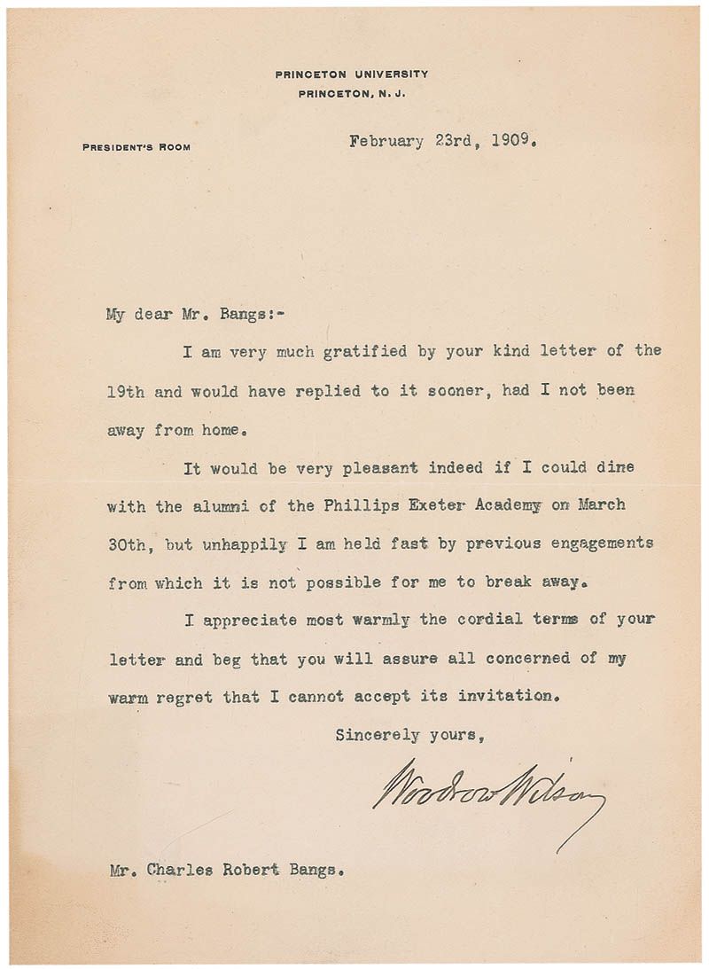 TLS, one page, 6 x 8.25, Princeton University letterhead, February 23, 1909. Letter to Charles Robert Bangs. In part: “It would be very pleasant indeed if I could dine with the alumni of the Phillips Exeter Academy on March 30th, but unhappily I am held fast by previous engagements from which it is not possible for me to break away.” Light scattered creases and toning, otherwise fine condition.