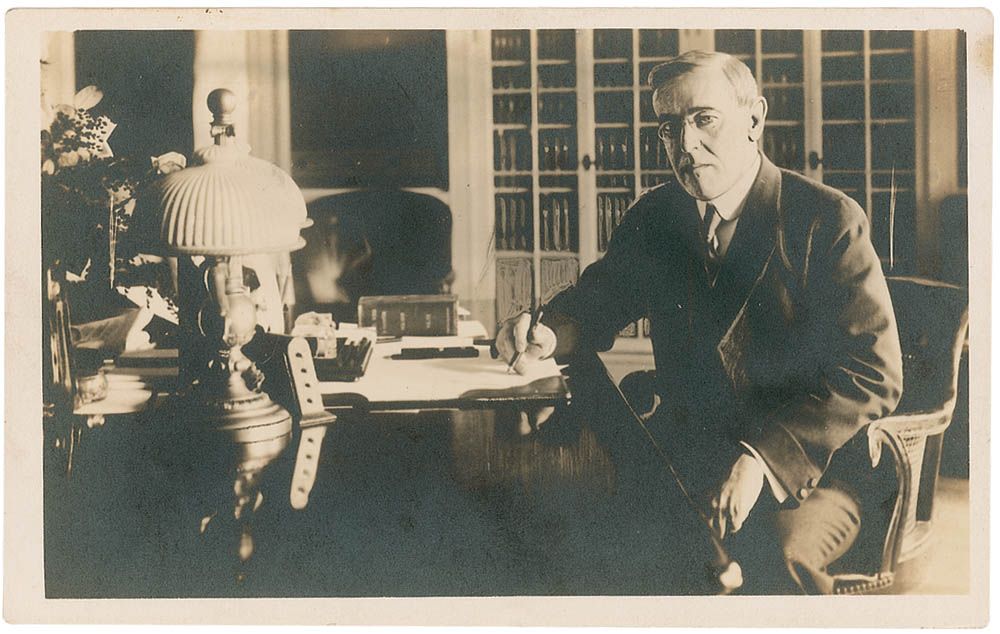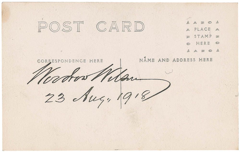 Vintage 5.25 x 3.25 postcard photo of Wilson at his desk in the White House, signed as president on the reverse in black ink, “Woodrow Wilson, 23 Aug. 1918.” A few light areas of soiling and heavy silvering to dark areas of the image, otherwise fine condition.