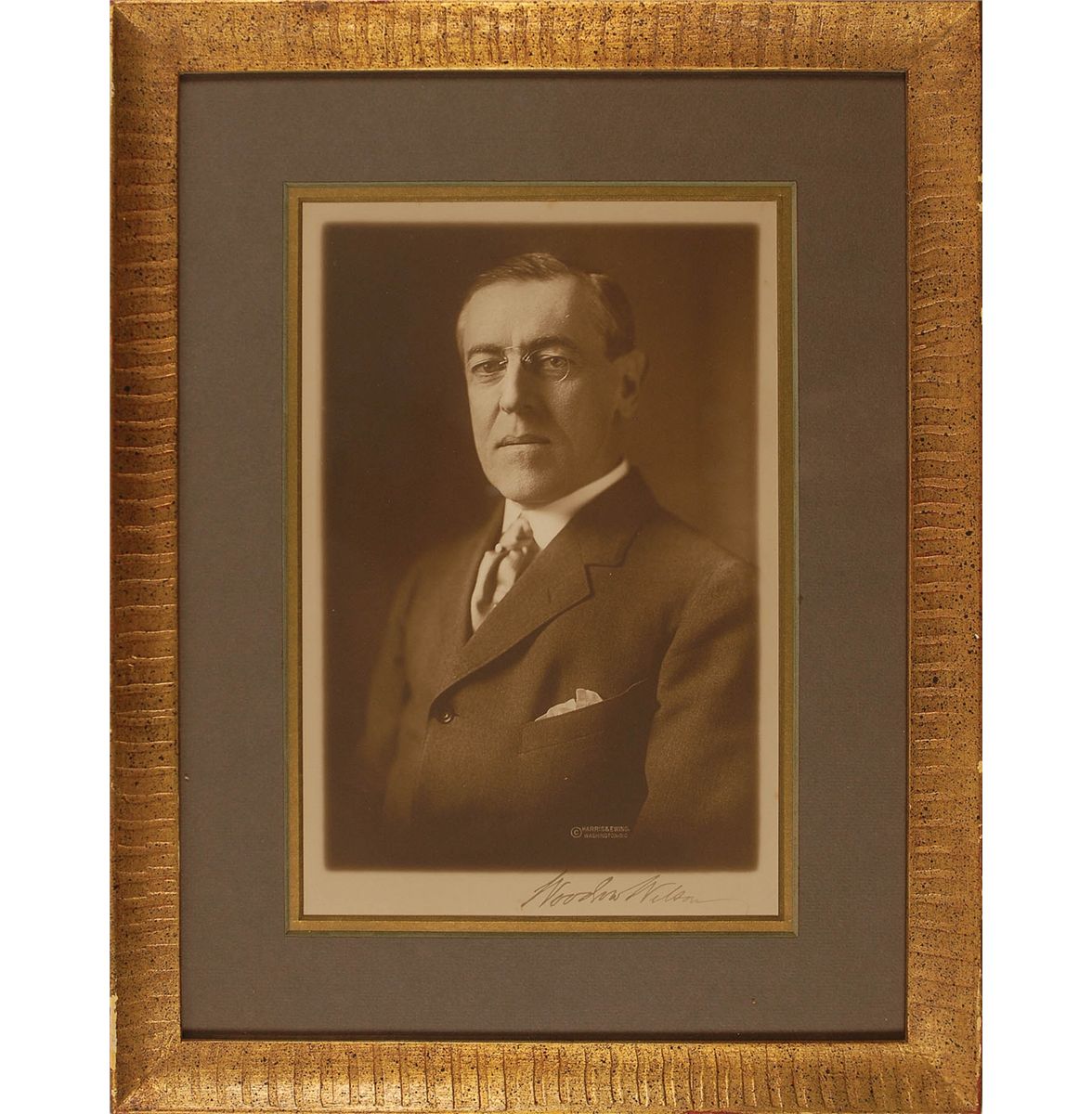 Distinguished vintage matte-finish 6.5 x 10 Harris and Ewing photo, signed in the lower border in fountain pen. Double matted and framed to an overall size of 12 x 15.5. In fine condition.