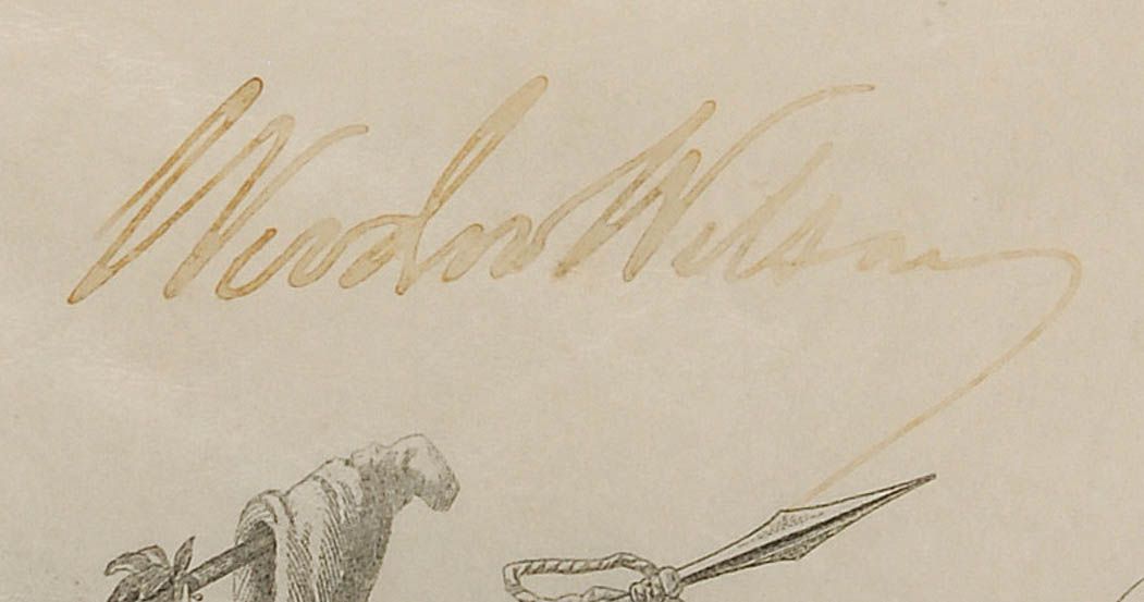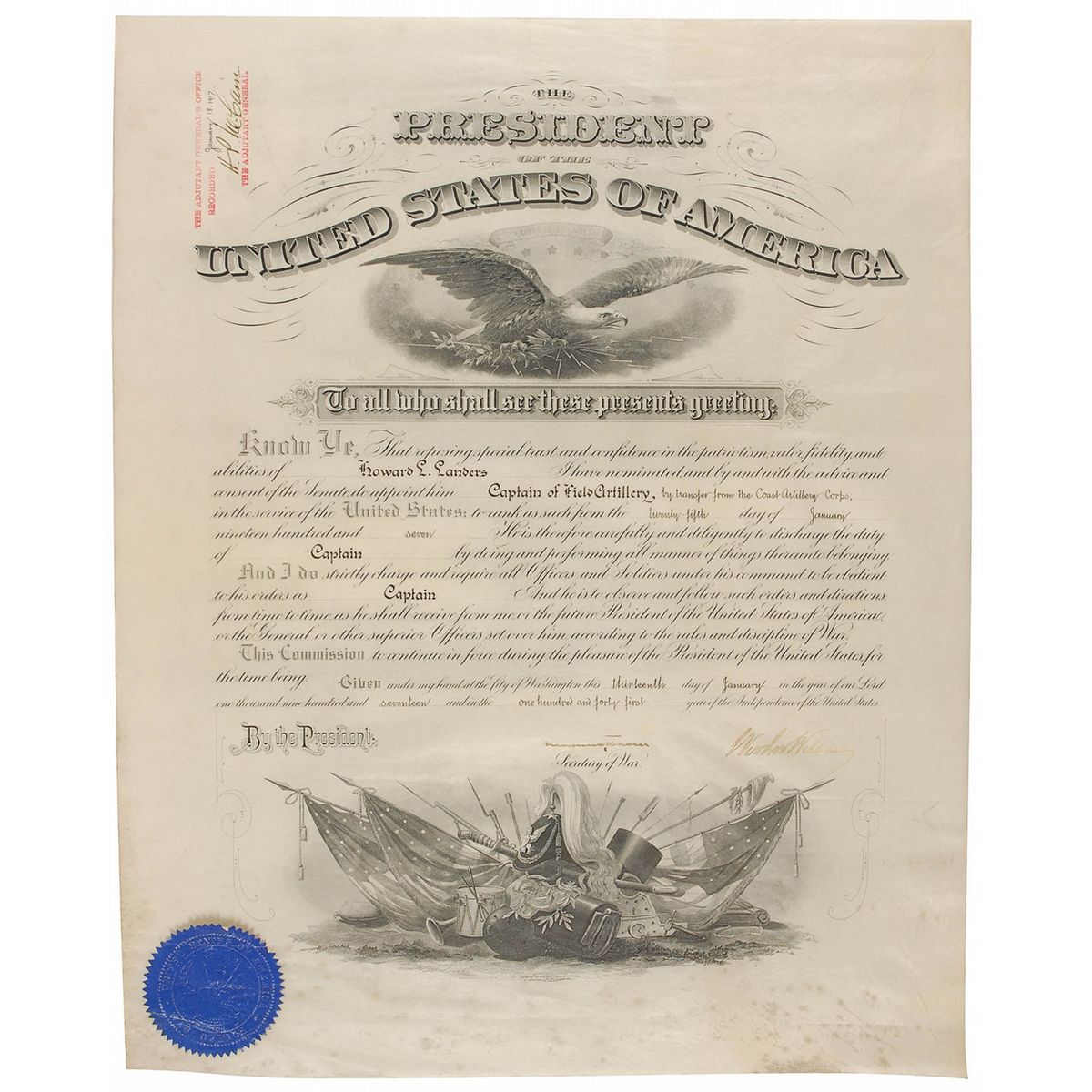 Partly-printed vellum DS, one page, 15.25 x 18.75, January 13, 1917. President Wilson appoints Howard L. Landers as “Captain of Field Artillery, by transfer from the Coast Artillery Corps.” Signed at the conclusion by Wilson and countersigned by Secretary of War Newton D. Baker. Also signed in the upper left by Adjutant General Henry Pinckney McCain, Senator John McCain’s uncle. Complete blue War Office seal affixed to the lower left. In very good to fine condition, with light storage folds and scattered creases, some foxing and soiling to the lower portion of the document, and the end of the signature light but legible.