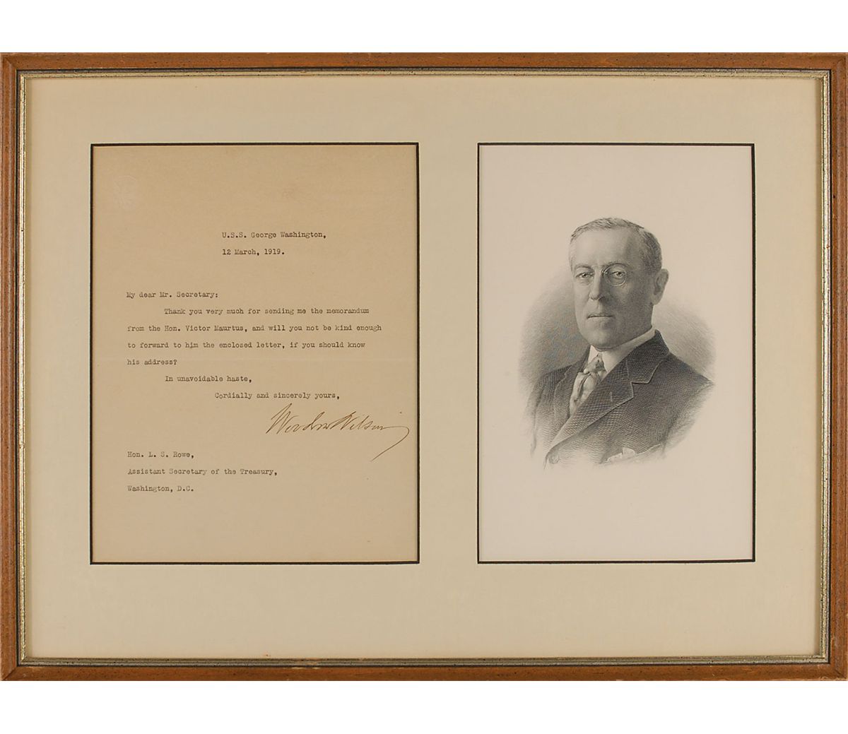 TLS as president, one page, 6.5 x 8.25, March 12, 1919. From the USS George Washington, Wilson writes to the assistant secretary of the treasury. In full: “Thank you very much for sending me the memorandum from the Hon. Victor Maurtus, and will you be kin