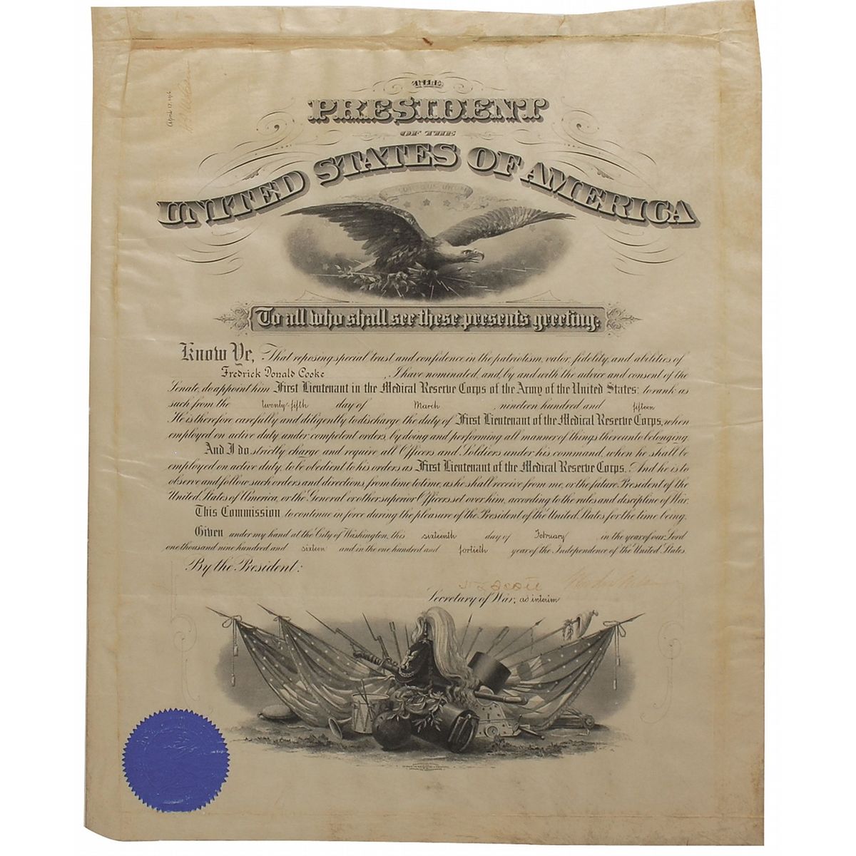 Partly-printed DS as president, one page, 15.5 x 19.25, February 16, 1916. President Wilson appoints Fredrick Donald Church a “First Lieutenant in the Medical reserve Corps of the Army of the United States.” Signed at the conclusion by Wilson and counters