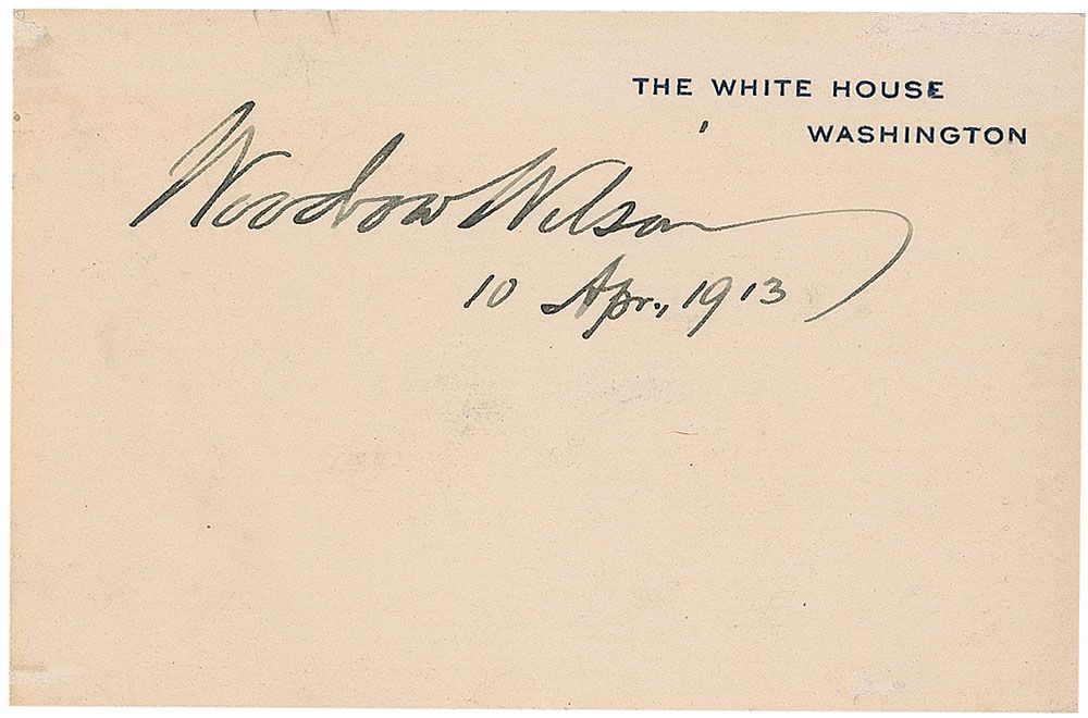 White House card signed in black ink, “Woodrow Wilson, 10 Apr., 1913.” In fine condition, with heavy mounting remnants to reverse.