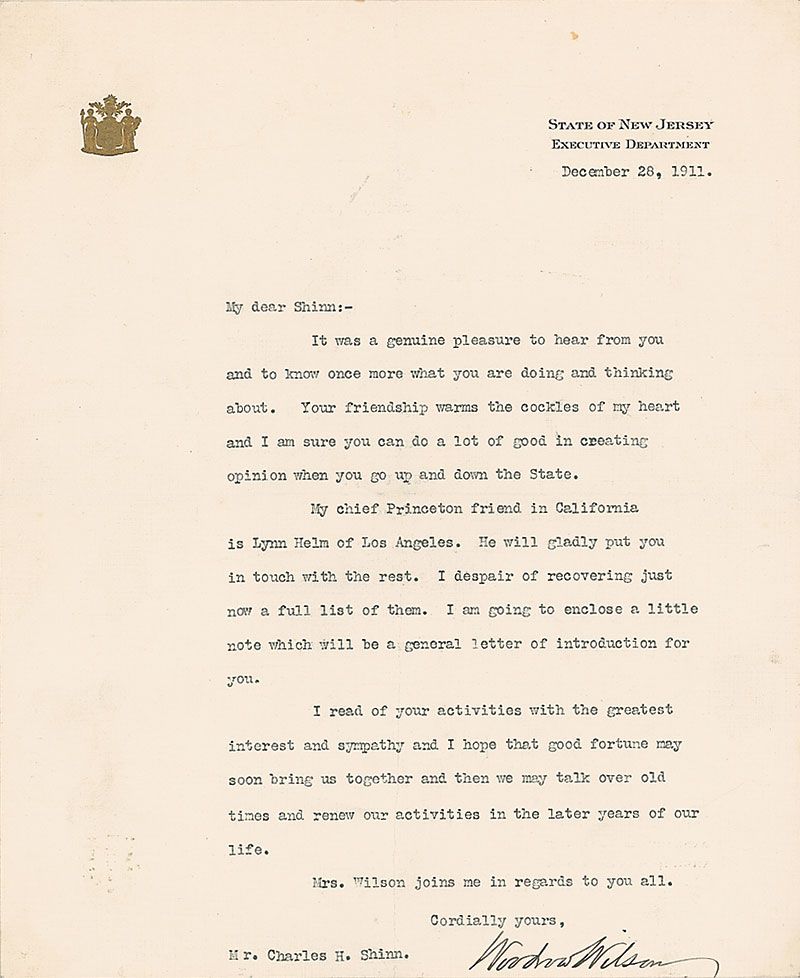 TLS, one page, 8 x 9.75, State of New Jersey Executive Department letterhead, December 28, 1911. Letter to Charles H. Shinn. In part: “It was a genuine pleasure to hear from you and to know once more what you are doing and thinking about. Your friendship warms the cockles of my heart and I am sure you can do a lot of good in creating opinion when you go up and down the State.” In fine condition, with central vertical and horizontal folds.