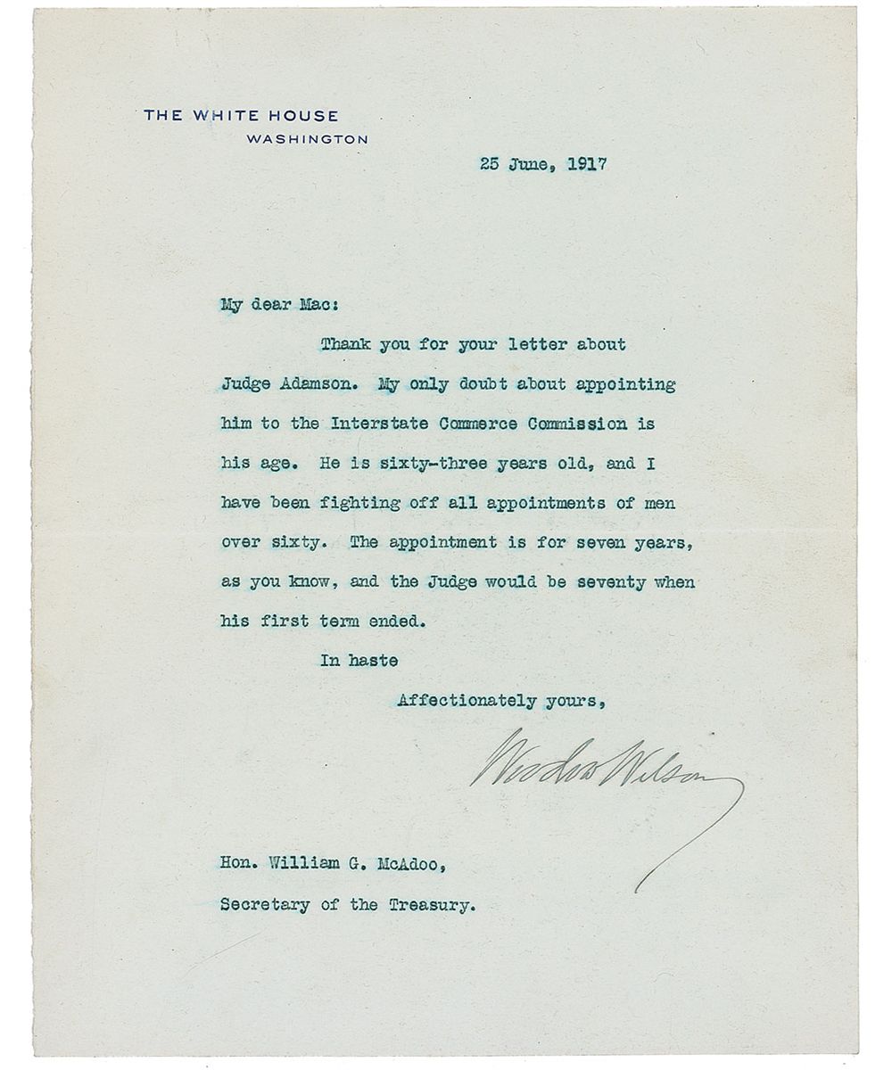 TLS as president, one page, 7 x 8.75, White House letterhead, June 25, 1917. Letter to Treasury Secretary William McAdoo. In full: “Thank you for your letter about Judge Adamson. My only doubt about appointing him to the Interstate Commerce Commission is his age. He is sixty-three years old, and I have been fighting off all appointments of men over sixty. The appointment is for seven years, as you know, and the Judge would be seventy when his first term ended.” In fine condition, with light overall haloing to typed text, not affecting the legibility.