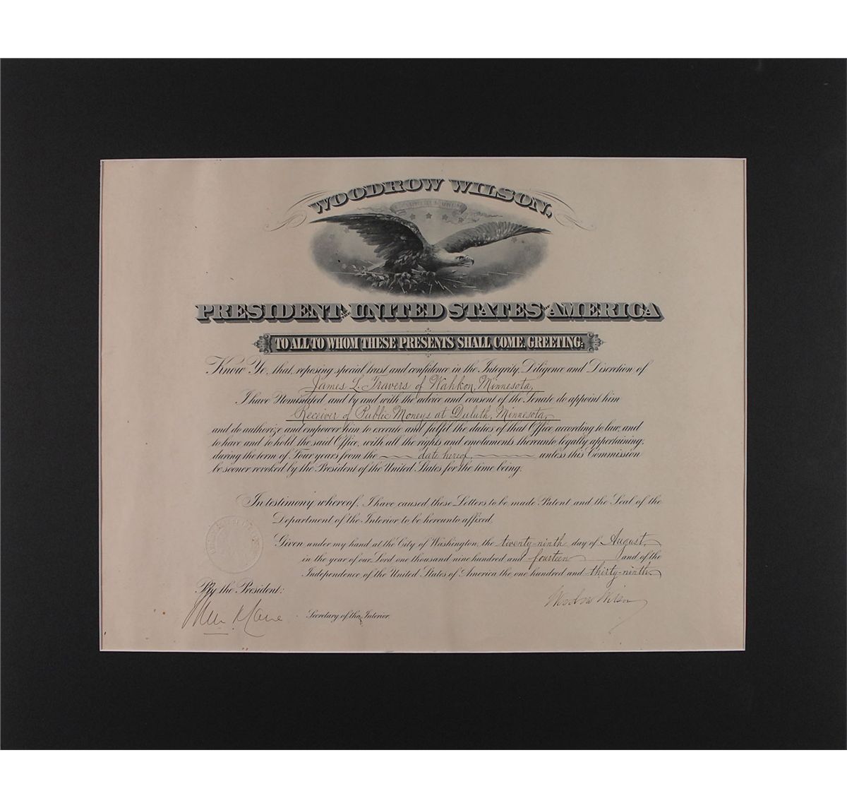 Partly-printed DS as president, one page, 18.5 x 14, August 29, 1914. Wilson appoints “James L. Travers of Wahkon, Minnesota,” to be “Receiver of Public Moneys at Duluth, Minnesota,” for a four-year term. Signed at the conclusion by Wilson and countersigned by Secretary of the Interior Franklin K. Lane. Matted to an overall size of 24.5 x 20. A few light ripples and creases and some stray ink marks and spots along bottom edge, otherwise fine condition. Oversized.