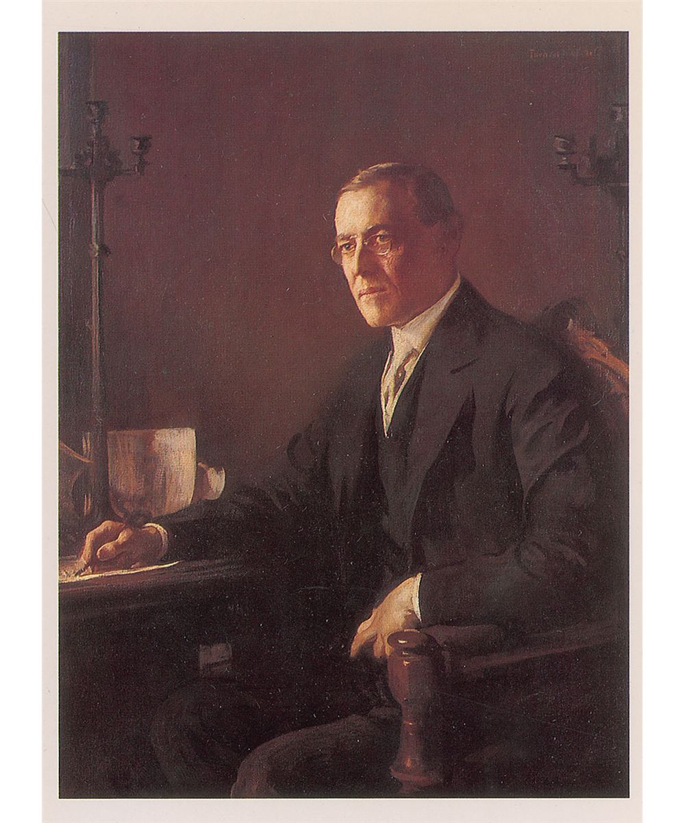 Ink signature, “Woodrow Wilson,” on an off-white 3.75 x 1.5 slip affixed to a 4.75 x 2.5 custom-made card for the collection of Dagmar and Lilly Printz. In fine condition, with a bit of mild toning and a punch hole to bottom of card.