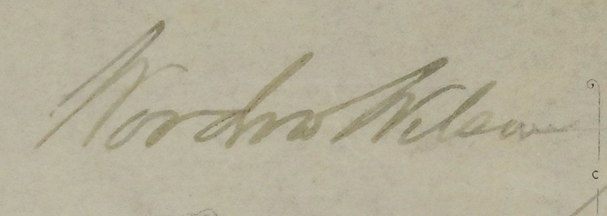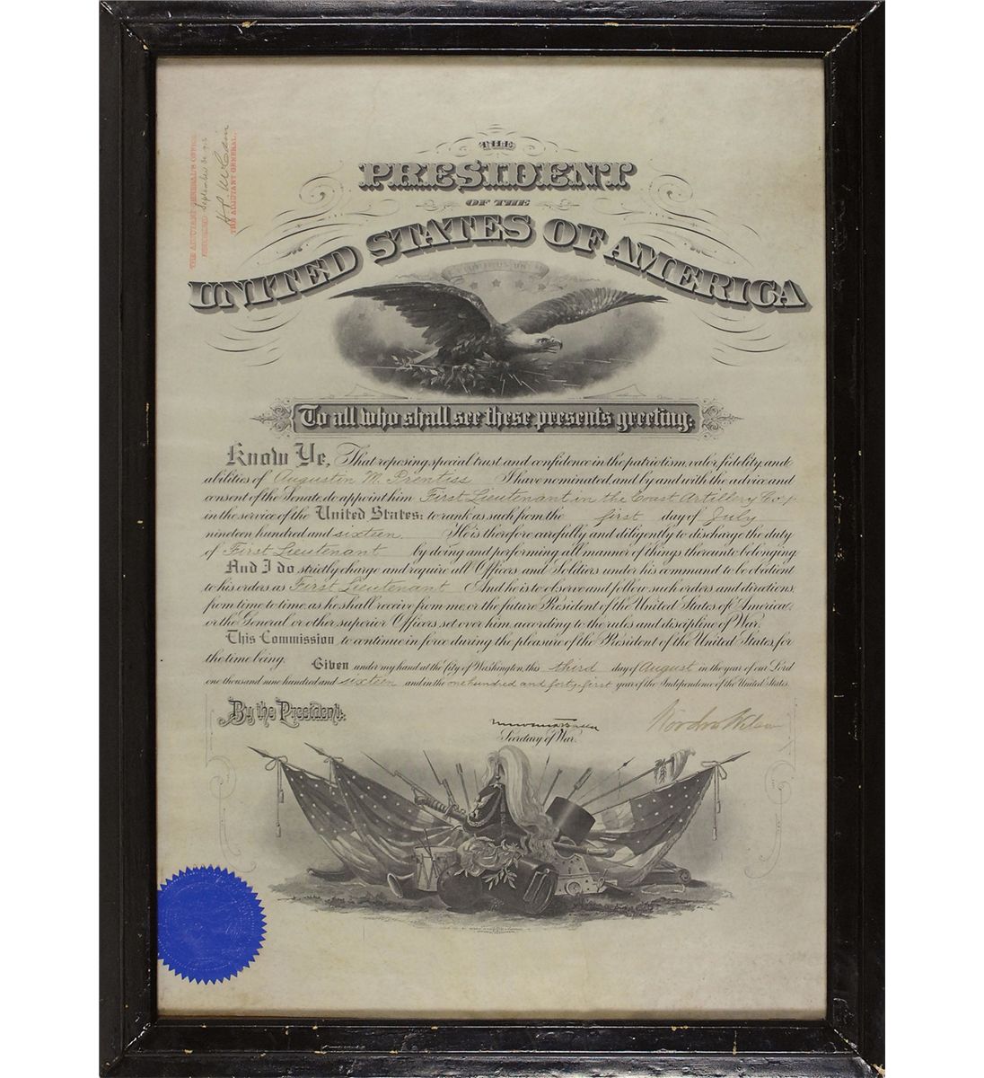 Partly-printed DS as president, one page, 13.5 x 19.5, August 3, 1916. President Wilson appoints Augustin M. Prentiss as “First Lieutenant in the Coast Artillery Corps.” Signed at the conclusion by Wilson and countersigned by Secretary of War Newton D. Baker. Framed to an overall size of 16 x 22. Blue War Office seal affixed to lower left remains fully intact. Light overall creases and foxing, otherwise fine condition.