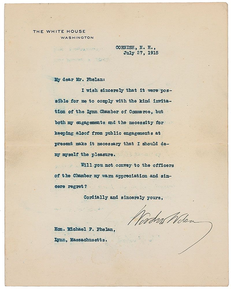 TLS as president, one page, 7 x 8.75, White House letterhead, July 27, 1915. Letter to Michael F. Phelan. In part: “I wish sincerely that it were possible for me to comply with the kind invitation of the Lynn Chamber of Commerce, but both my engagements and the necessity for keeping aloof from public engagements at present make it necessary that I should deny myself the pleasure.” Mild soiling, otherwise fine condition.