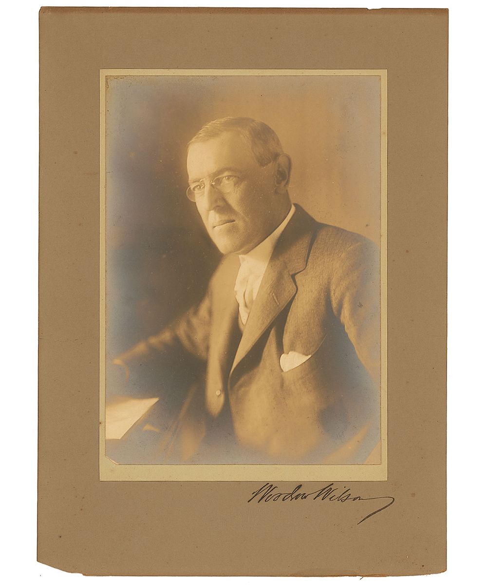Vintage matte-finish 6.5 x 9.25 portrait affixed to its original 9.5 x 13.25 Harris and Ewing mount, boldly signed on the mount in fountain pen, “Woodrow Wilson.” In very good condition, with some slight foxing, silvering to borders of image, chips to lower left corners of photo and mount, and a couple tears to mount.