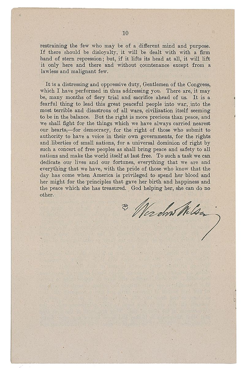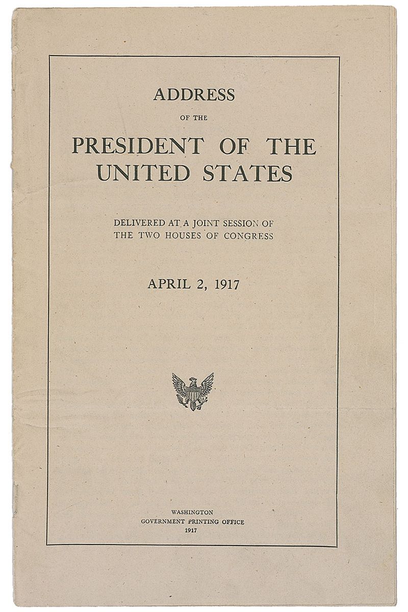 Printed speech in booklet form, “Address of the President of the United States, Delivered at a Joint Session of the Two Houses of Congress, April 2, 1917,” 6 x 9, ten pages, issued by the Government Printing Office. Historic speech in which Wilson asks the US Congress for a declaration of war on Germany, signed at the conclusion in black ink by Wilson. In very good condition, with two horizontal folds, scattered creases, a couple areas of paper loss to back cover, as well as some mounting remnants and some mild soiling and handling wear. After three years attempting to keep the US out of the conflict, Wilson could no longer ignore the growing threat of German submarines; this historic speech marks the nation’s entrance into the war, helping ‘make the world safe for democracy.’