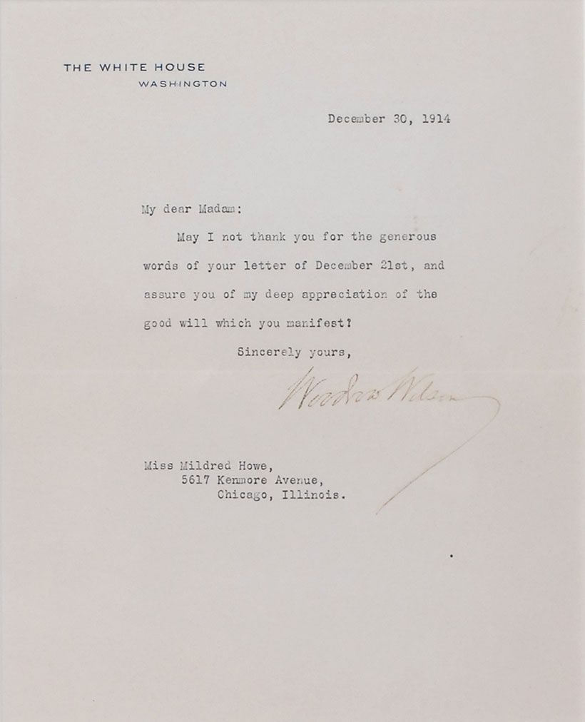 TLS as president, one page, 6.75 x 8.5, White House letterhead, December 30, 1914. Letter of thanks to a woman in Chicago. In full: “May I not thank you for the generous words of your letter of December 21st, and assure you of my deep appreciation of the good will which you manifest!” Matted and framed to an overall size of 11.5 x 13.25. Some light skipping and feathering to signature, which is also a shade or two light, but completely legible, otherwise fine condition.