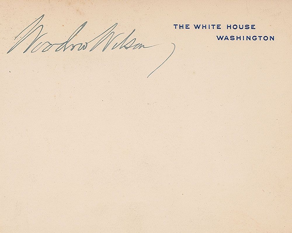 Unusual White House card, 4.25 x 3.25, signed near the top in black ink, “Woodrow Wilson.” Some mild toning and soiling, and mounting remnants to reverse, otherwise fine condition.