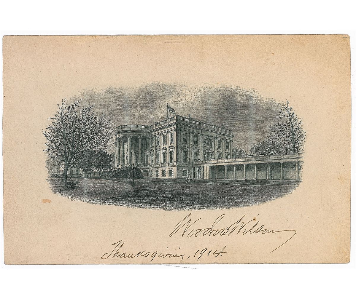 Engraved portrait of the exterior of the White House, 6 x 4, signed at the bottom as president, “Woodrow Wilson, Thanksgiving, 1914.” Toning and slightly trimmed edges, otherwise fine condition.