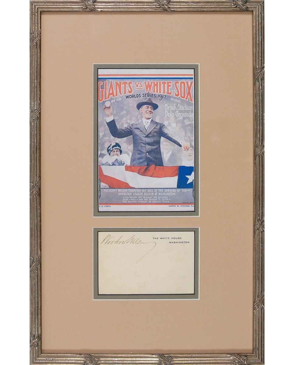 White House card, signed along the top in black ink, “Woodrow Wilson.” Double-matted and framed, with a reproduction of the cover of the 1917 World Series program featuring Wilson throwing out the first pitch, to an overall size of 10 x 15.5. In fine condition, with just a bit of trivial soiling.