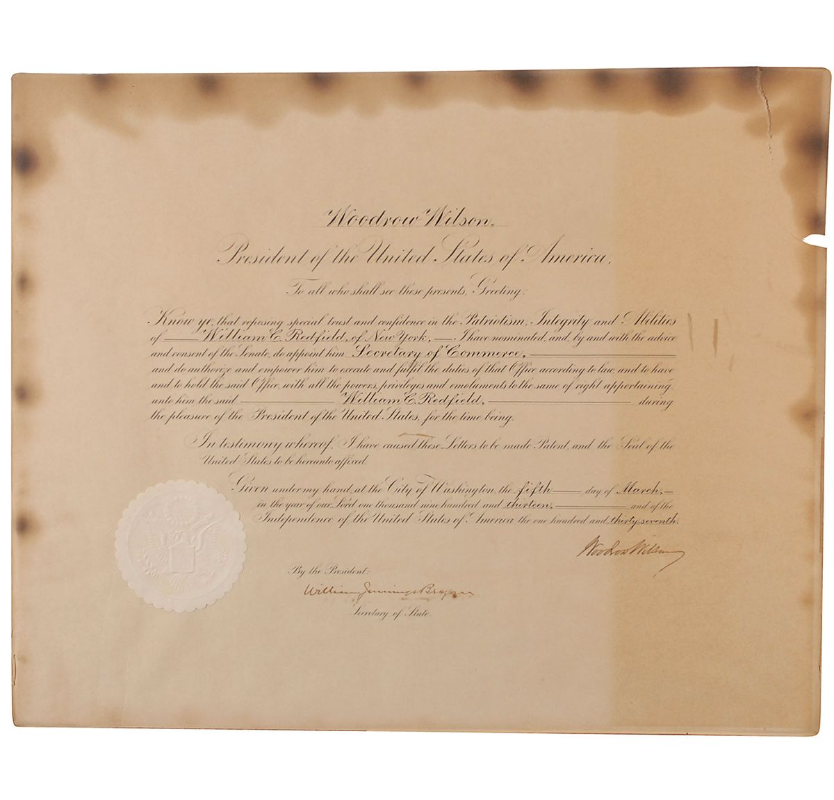 Partly-printed DS as president, one page, 22 x 18, March 5, 1913. Presidential cabinet appointment. In part: “Know ye that reposing special trust and confidence in the Patriotism, Integrity and Abilities of William C. Redfield of New York, I have nominated, and, by and with the advice and consent of the Senate, do appoint him Secretary of Commerce.” Signed at the conclusion by President Wilson and countersigned by Secretary of State William Jennings Bryan. White paper seal affixed to lower left remains fully intact. In very good condition, with significant toning and staining to edges, lighter band of toning to right side, overall brittleness, and upper right corner detached but present; as most flaws reside to edges, the appointment could be nicely matted for clean display. Prior to this existed the United States Department of Commerce and Labor, which was split into separate divisions on March 4, 1913, the day of Wilson’s inauguration. A historically significant document that established a new cabinet position, tenth in the line of succession.