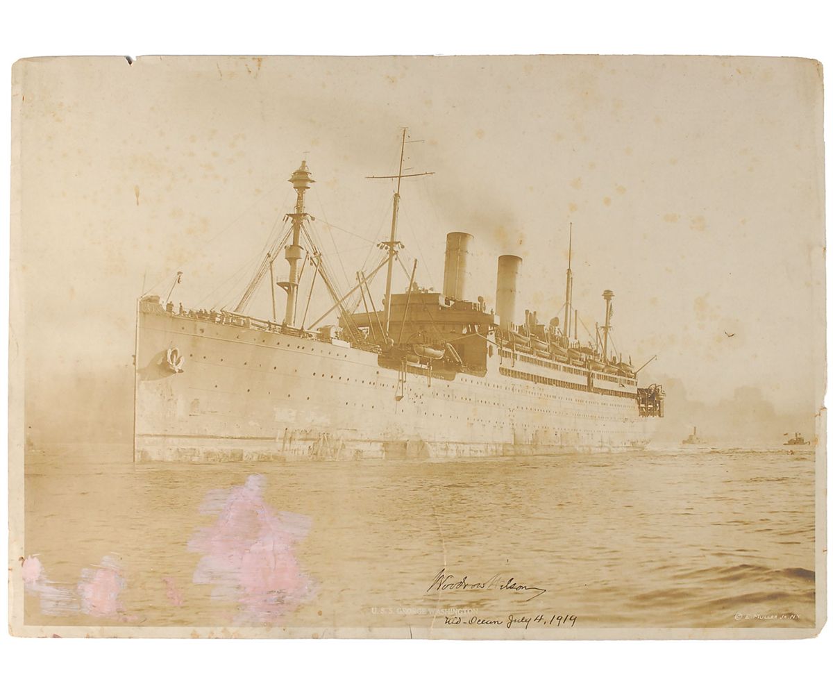 Pearl-finish sepia 19.5 x 14 photo of the U. S. S. George Washington at sea by E. Muller, Jr. of New York, signed in black ink, “Woodrow Wilson,” and dated “Mid-Ocean July 4, 1919,” in another hand. In very good condition, with scattered toning and foxing, several edge tears, with one extending through first letter of Wilson’s signature, a few creases, and a couple areas of a White-Out-type application along bottom portion of image.