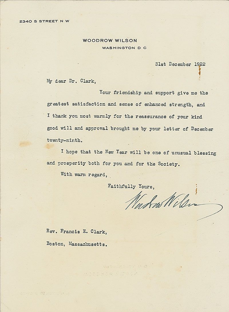 TLS, one page, 6.75 x 9.25, personal letterhead, December 31, 1922. Letter to Reverend Francis Edward Clark of the Society of Christian Endeavor. In full: “Your friendship and support give me the greatest satisfaction and sense of enhanced strength, and I thank you most warmly for the reassurance of your kind good will and approval…I hope that the New Year will be one of unusual blessing and prosperity both for you and the Society.” Light creases and staining, otherwise fine condition.