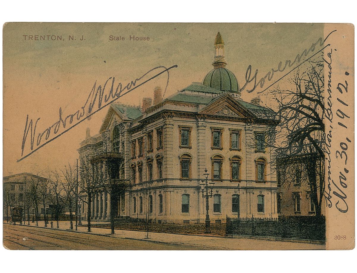 Color postcard of the New Jersey State House in Trenton, 3.5 x 5.5, neatly signed in black ink, “Woodrow Wilson, Governor.” Collector’s notation in the right border indicates that it was received on November 30, 1912. A bit of feathering to ink, light dings to corner tips, and the signature underlined by the collector, otherwise fine condition.