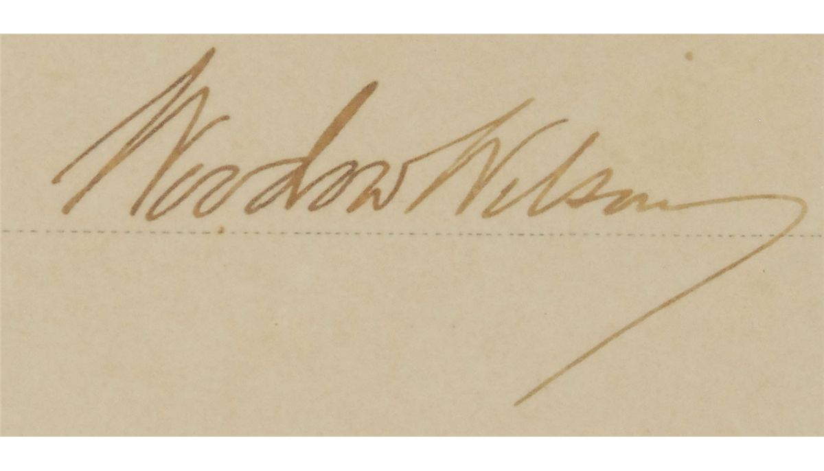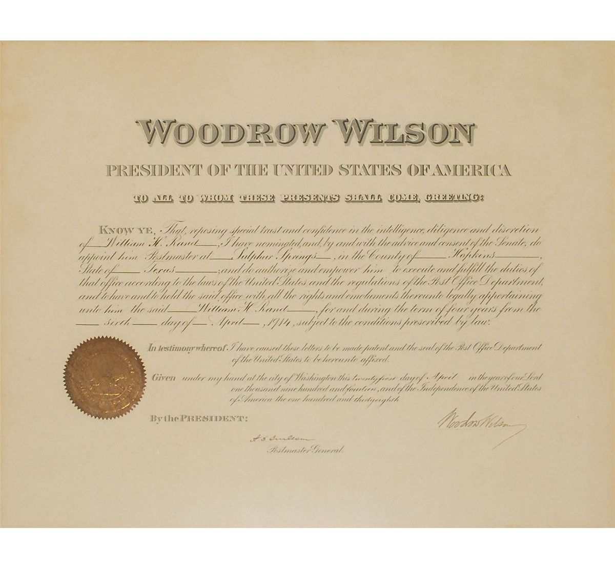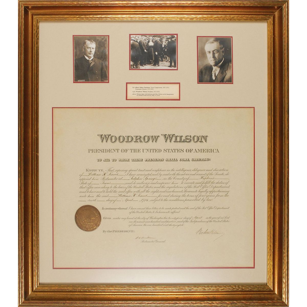 Partly-printed DS as president, one page, 19.5 x 15.5, April 21, 1914. President Wilson appoints William H. Rand to be the Postmaster of Sulpher Springs, Texas. Signed at the conclusion by Wilson, and countersigned by Postmaster General Albert Burleson. Double-matted and framed with a photo of Wilson, one of Burleson, and one of the two men together to an overall size of 26 x 30. In fine condition, with a uniform shade of toning. The gold foil seal is toned, but intact. Oversized.