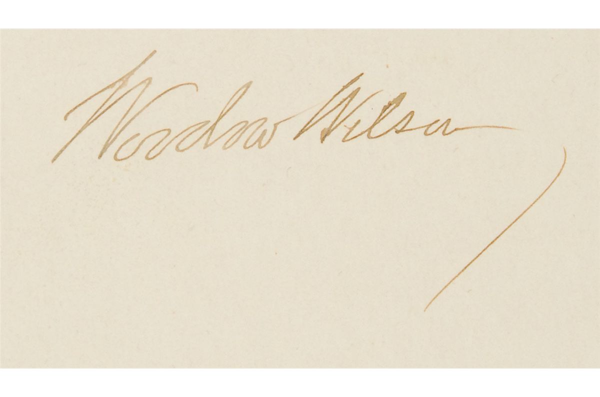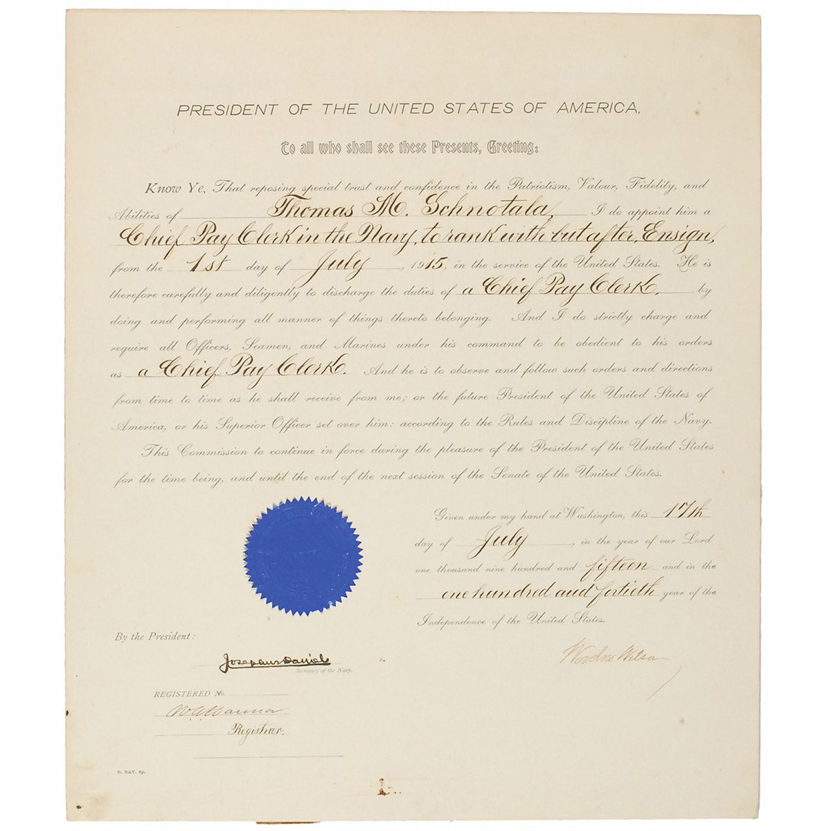 Partly-printed DS as president, one page, 15.5 x 18, July 17, 1915. President Wilson appoints Thomas M. Schnotala a “Chief Pay Clerk in the Navy, to rank with but after Ensign.” Signed at the conclusion by Wilson and countersigned by Secretary of the Navy Josephus Daniels. Document is affixed to an identical size board. In fine condition, with a uniform shade of light toning, and a few small stains and light soiling. The blue seal is crisp and intact.
