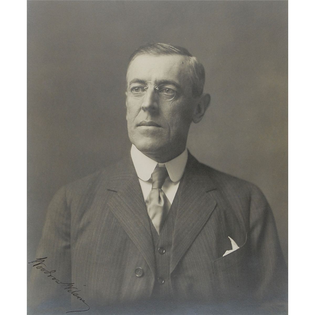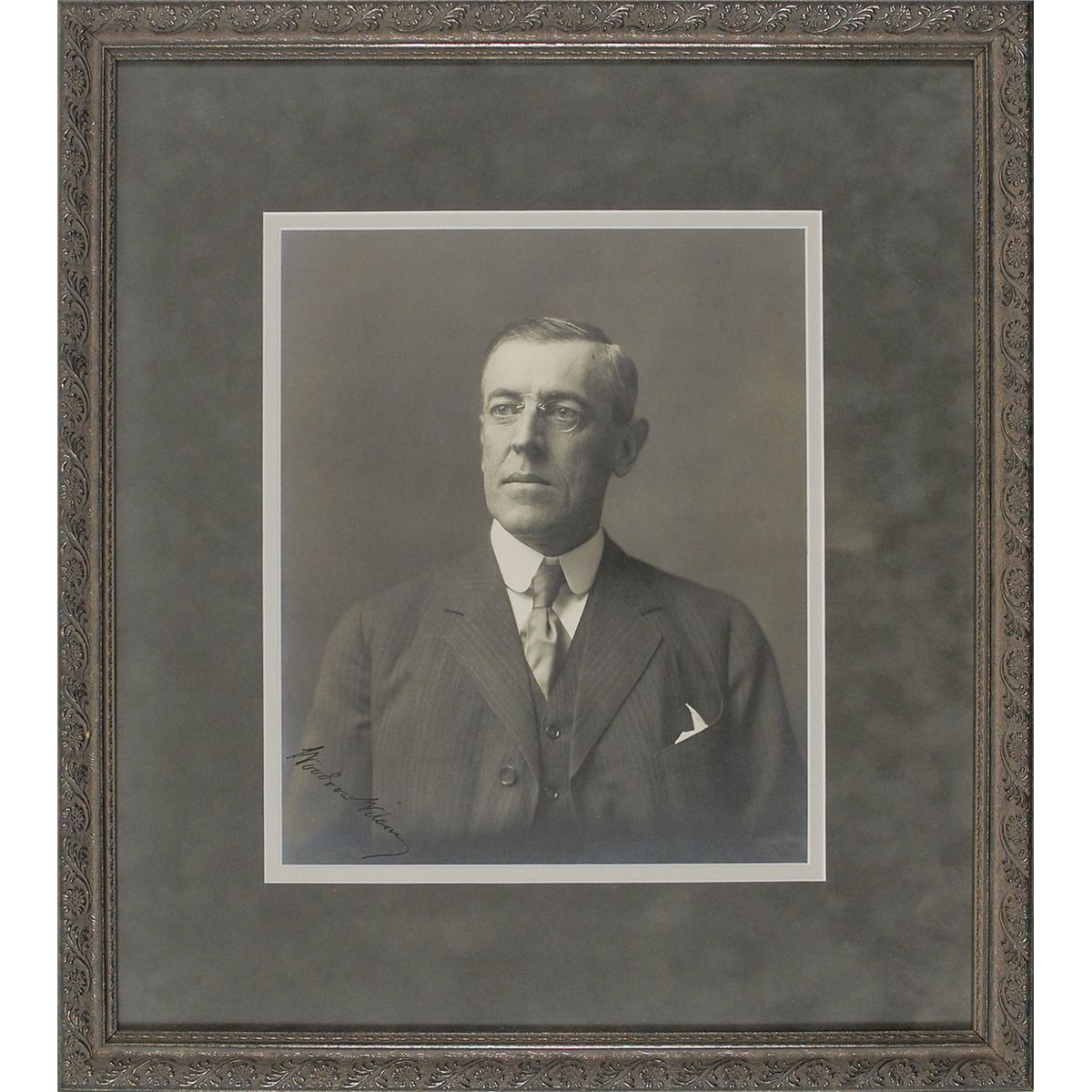 Superlative matte-finish 9.5 x 11.5 bust portrait of Wilson in a pinstripe suit, boldly signed in the lower left corner in fountain pen. Gorgeously double-suede-matted and framed to an overall size of 18 x 20. In fine condition. An exceptionally sharp formal image of the president.