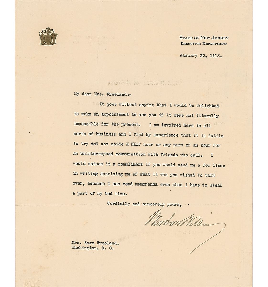 TLS as president-elect, one page, 8 x 9.5, State of New Jersey letterhead, January 30, 1913. Letter to Sara Freeland, in part: “I am involved here in all sorts of business and I find by experience that it is futile to try and set aside a half hour or any part of an hour for an uninterrupted conversation with friends who call. I would esteem it a compliment if you would send me a few lines in writing apprising me of what it was you wished to talk over, because I can read memoranda even when I have to steal a part of my bed time.” Intersecting folds and light scattered creasing, light smudging and mirroring to text, and some scattered trivial foxing, otherwise fine condition. Accompanied by a photocopy of the original letter to Wilson.