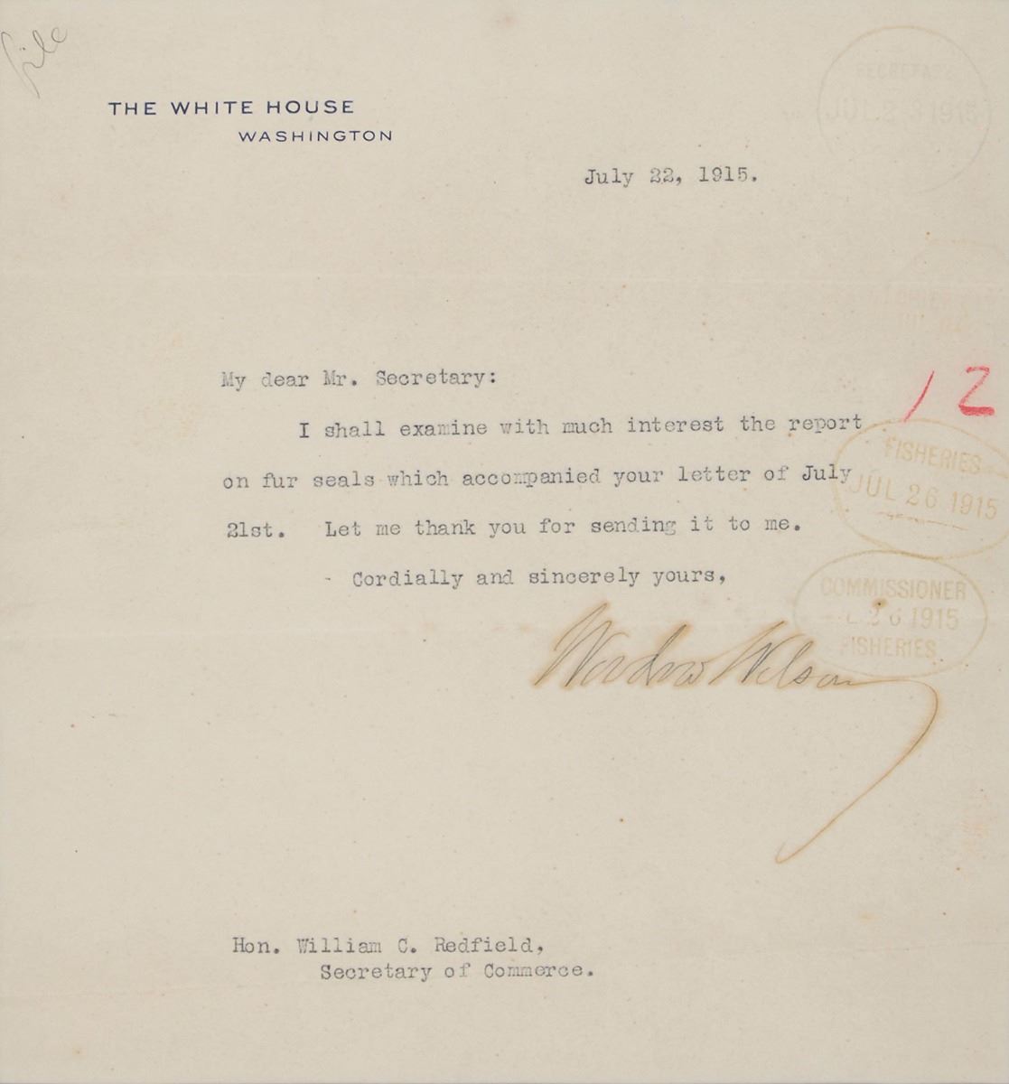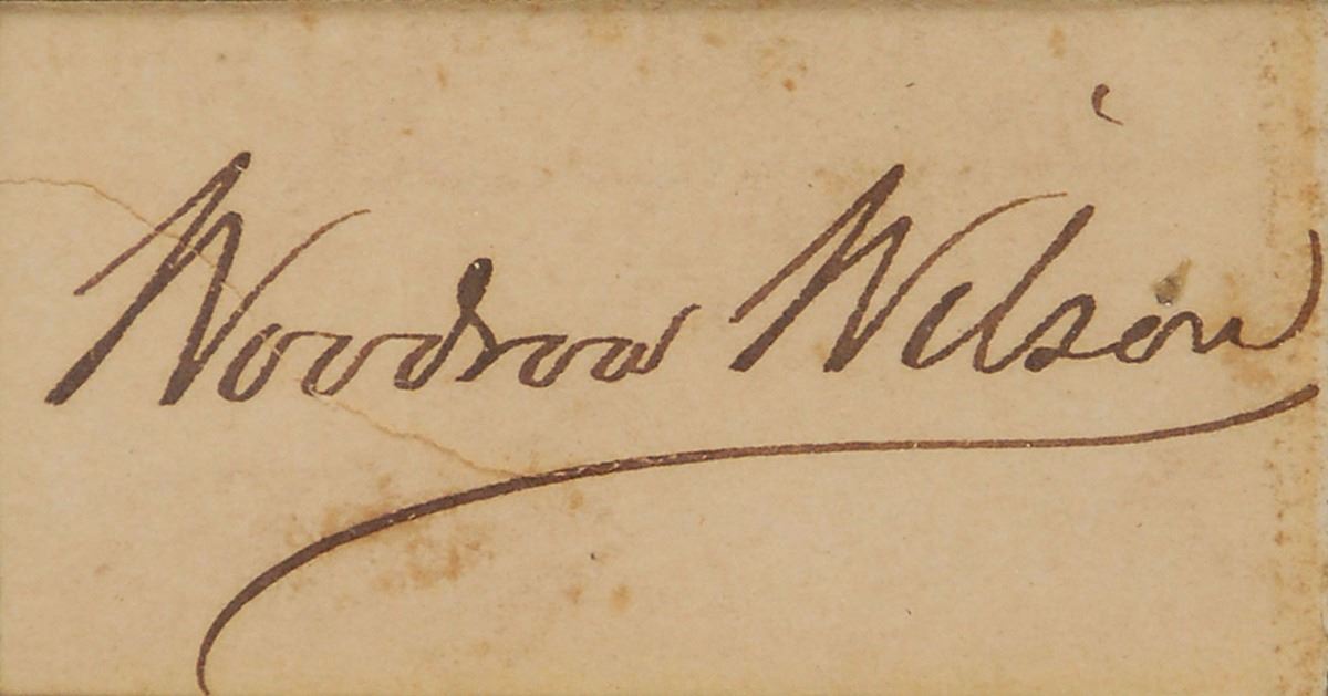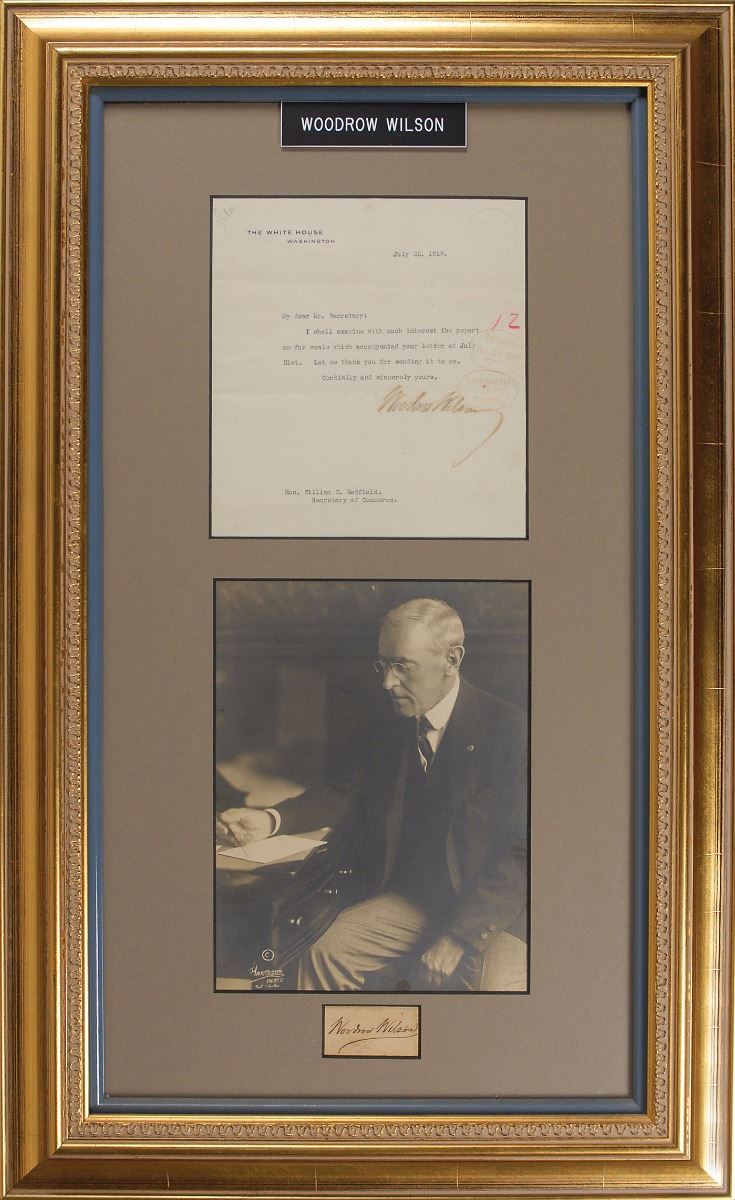 TLS as president, signed "Woodrow Wilson," one page, 6.75 x 7.25, White House letterhead, July 22, 1915. Letter to Secretary of Commerce William C. Redfield, in part: "I shall entertain with much interest the report on fur seals which accompanied your letter." Also includes an earlier ink signature, "Woodrow Wilson," on an off-white 2 x 1 slip. Both are double-matted and framed with a period Hartsook photo and nameplate affixed to the glass to an overall size of 16 x 26. In overall very good condition, with scattered creases, toning, and several office stamps and notations to the letter, substantial haloing to the signature on the letter, and scattered soiling and a tear passing through a portion of the signature on the slip.