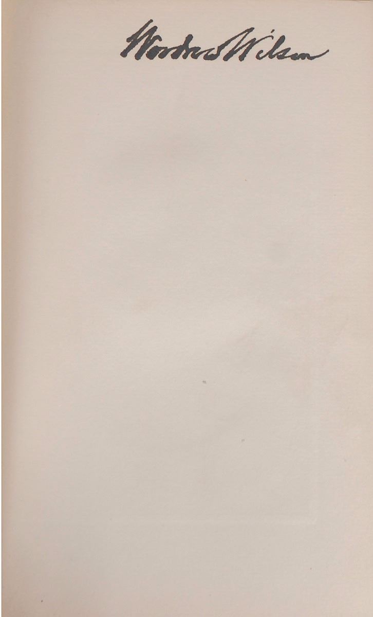 Complete book set: History of the American People, Volumes 1–5. NY: Harper & Brothers, 1903. Hardcovers, 6.25 x 9.25. Boldly signed on an opening page of the fourth volume in black ink. Autographic condition: slight soiling and spreading to the signature, otherwise fine condition. Book conditions: signed volume, VG-/None; unsigned volumes, VG-/None. The culmination of a series of articles written for Harper's Magazine, this full five-volume set serves as an impressive example of a format seldom signed by Wilson.