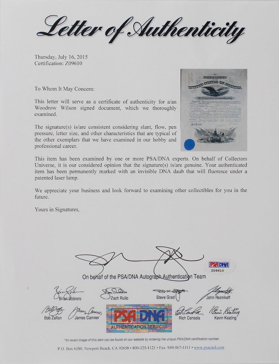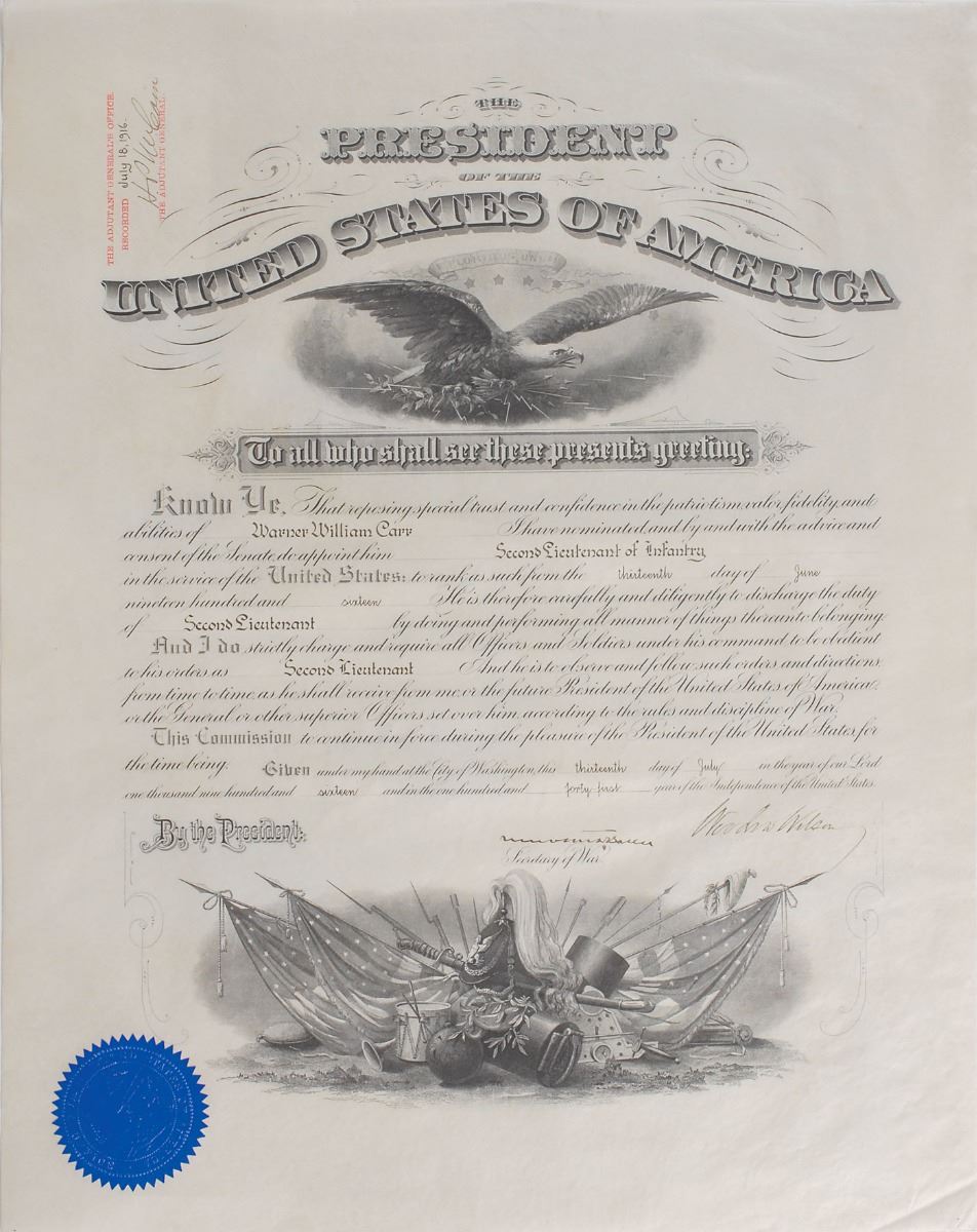 Partly-printed vellum DS as president, one page, 15.5 x 19.5, July 13, 1916. President Wilson appoints Warner William Carr as “Second Lieutenant of Infantry in the service of the United States.” Crisply signed at the conclusion by Wilson and countersigned by Secretary of War Newton D. Baker. The blue seal affixed to the lower left remains crisp and fully intact. In fine condition, with expected document wear. Accompanied by a full letter of authenticity from PSA/DNA.