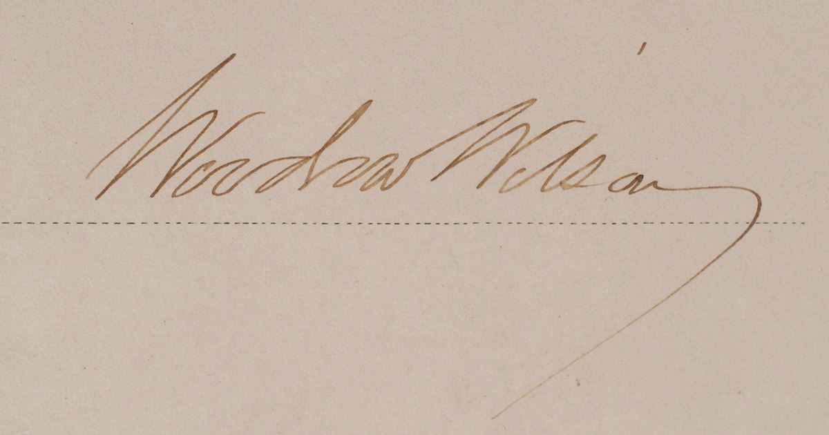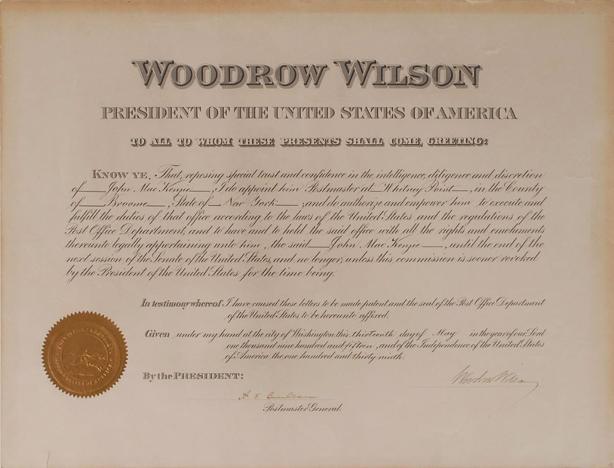 Partly-printed DS as president, one page, 19 x 14.5, May 13, 1915. President Wilson appoints John MacKenzie as “Postmaster at Whitney Point, in the County of Broome, State of New York.” Signed at the conclusion by Wilson, and countersigned by Postmaster General Albert S. Burleson. Embossed gold seal affixed to lower left remains fully intact. In fine condition, a small tear to bottom edge.