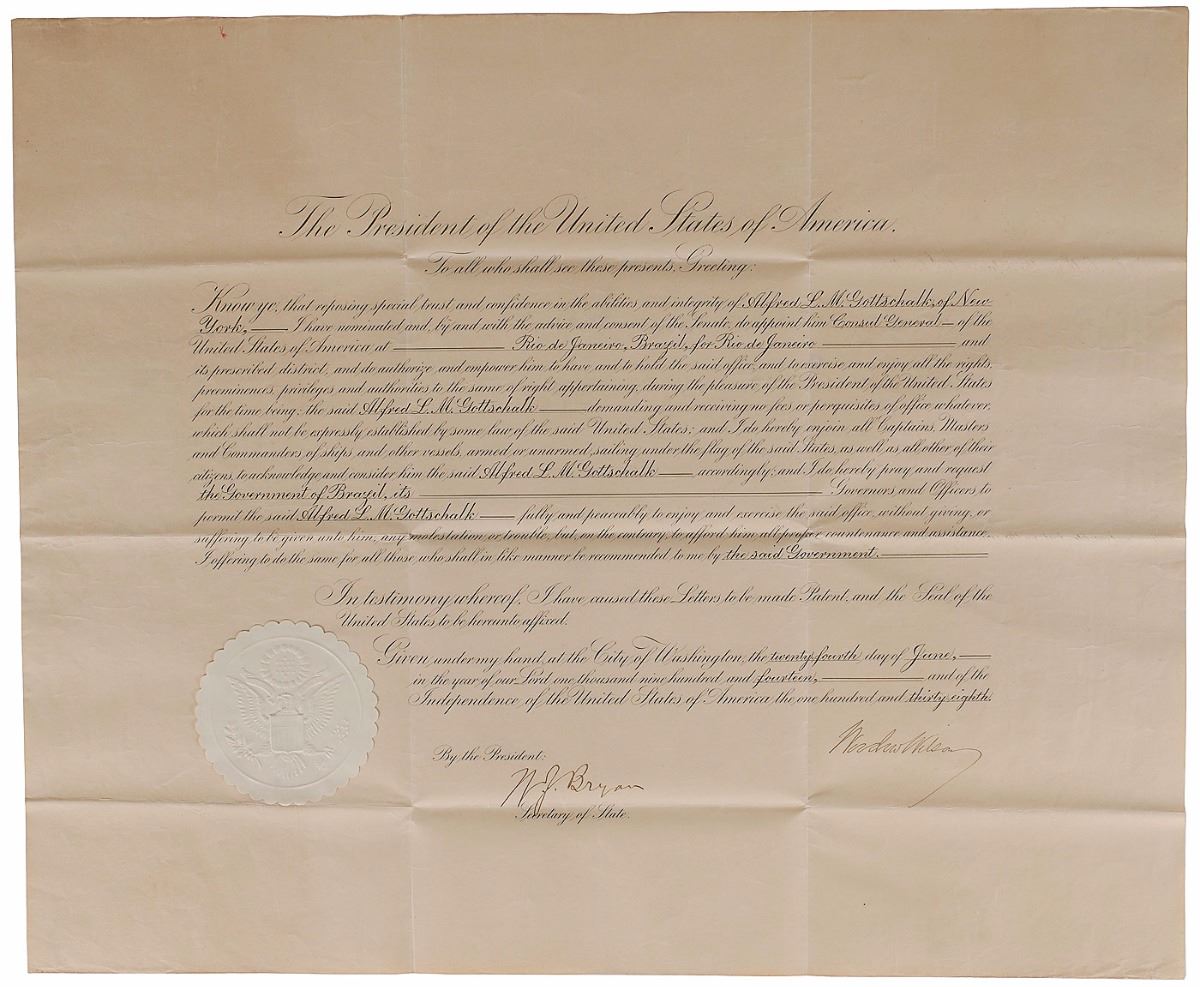 Partly-printed DS, one page, 22.75 x 18.75, June 24, 1914. President Wilson appoints Alfred L. M. Gottschalk as “Consul General of the United States of America at Rio de Janeiro, Brazil, for Rio de Janeiro.” Signed at the conclusion by Wilson and countersigned by Secretary of State William Jennings Bryan. White paper seal affixed to lower left remains fully intact. In fine condition, with intersecting folds.