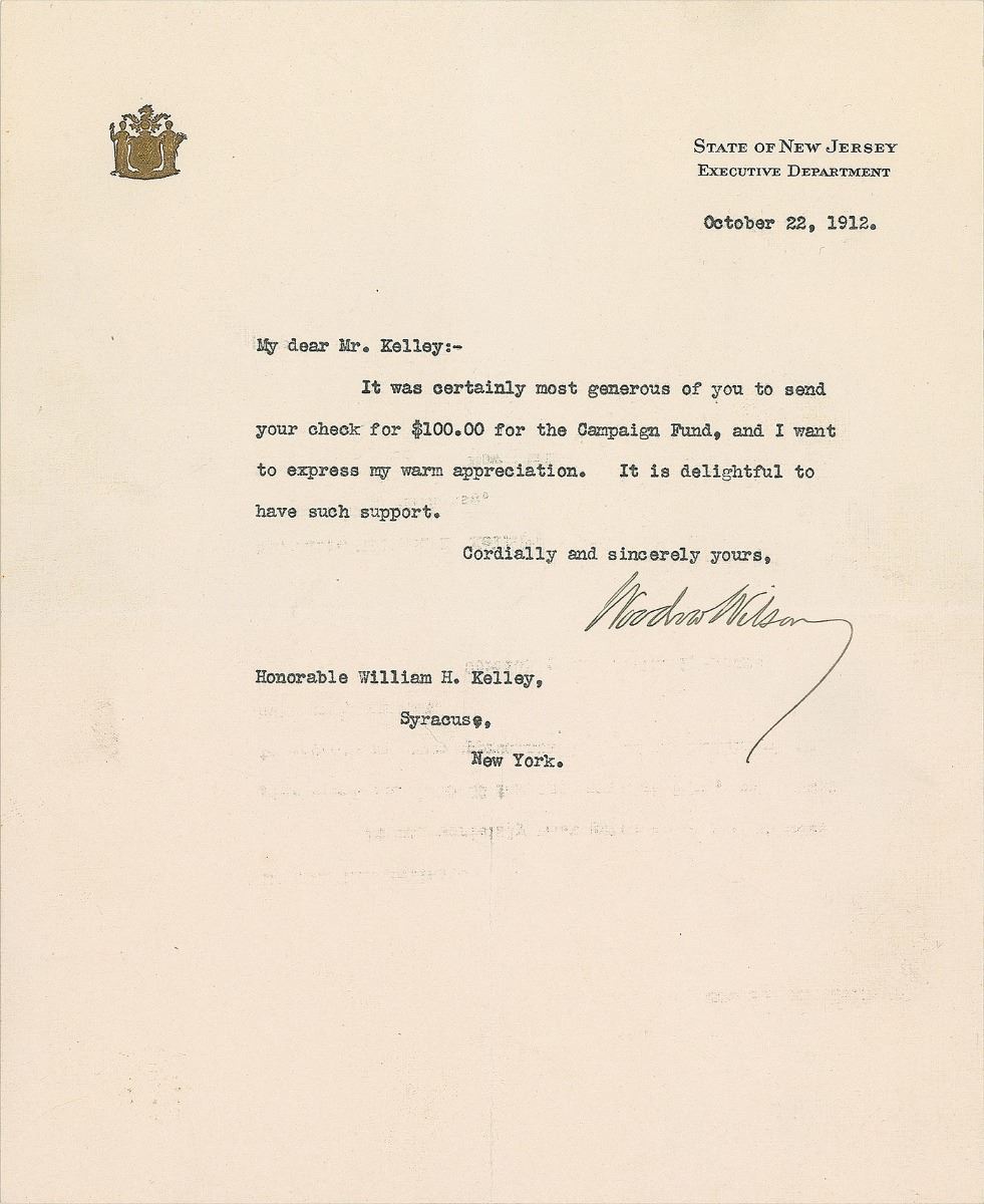 TLS, one page, 7.75 x 9.75, State of New Jersey letterhead, October 22, 1912. Letter to William H. Kelley, in full: “It was certainly most generous of you to send your check for $100.00 for the Campaign Fund, and I want to express my warm appreciation. It is delightful to have such support.” In fine condition, with light offsetting of the type from folding.