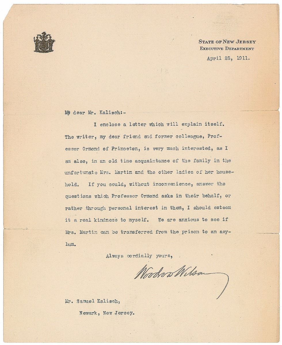TLS, one page, 7.75 x 9.75, State of New Jersey Executive Department letterhead, April 25, 1911. Letter to Justice Samuel Kalisch, who he had recently appointed as a justice on the New Jersey Supreme Court. In part: “I enclose a letter which will explain itself. The writer, my dear friend and former colleague, Professor Ormond of Princeton, is very much interested, as I am also, in an old time acquaintance of the family in the unfortunate Mrs. Martin and the other ladies of her household….We are anxious to see if Mrs. Martin can be transferred from the prison to an asylum.” In fine condition, with small spits to folds and a missing corner tip.