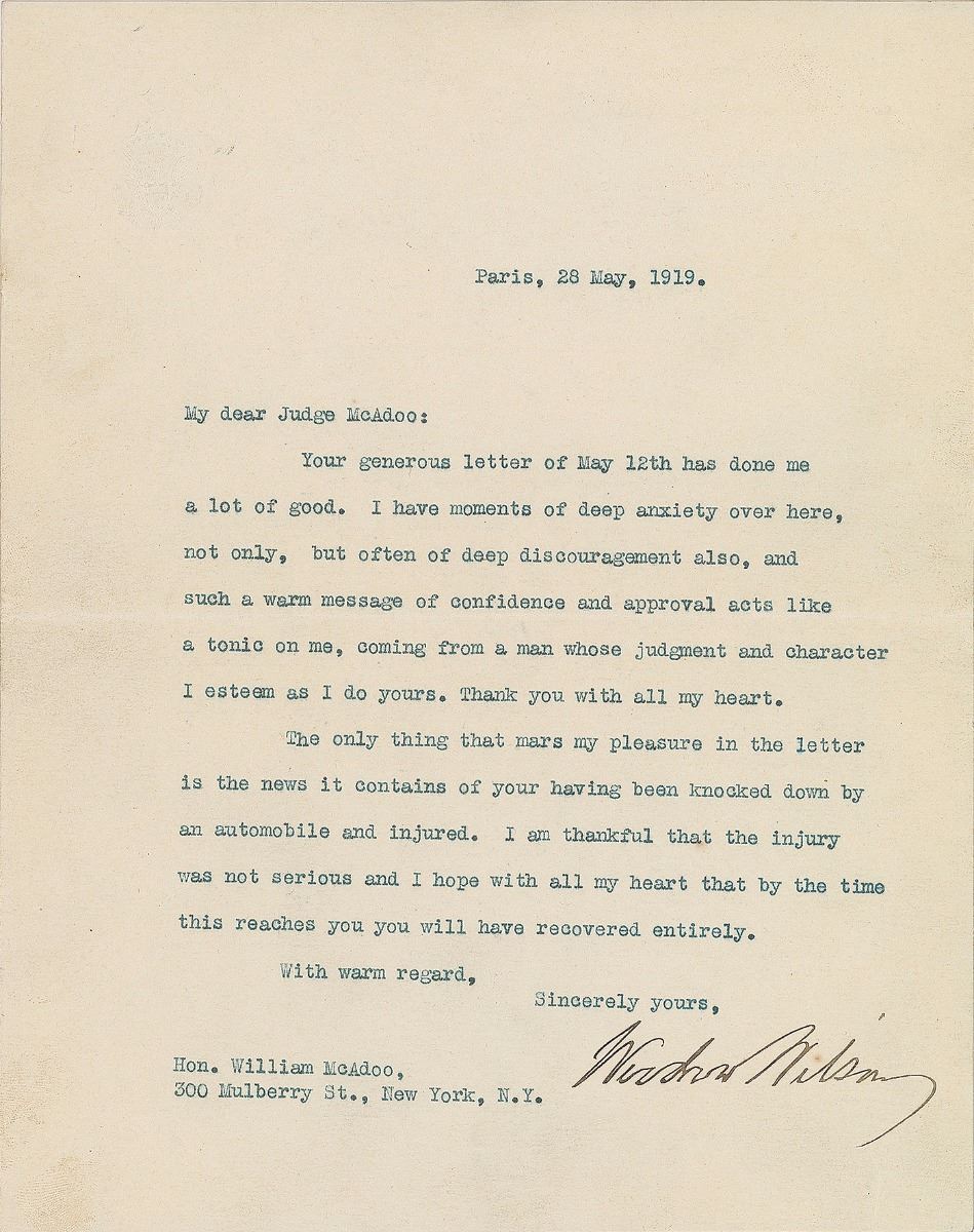 TLS as president, one page, 7 x 8.75, embossed Presidential letterhead, May 28, 1919. Letter to his son-in-law and former Secretary of the Treasury William McAdoo, in full: “Your generous letter of May 12th has done me a lot of good. I have moments of deep anxiety over here, not only, but often of deep discouragement also, and such a warm message of confidence and approval acts like a tonic on me, coming from a man whose judgment and character I esteem as I do yours. Thank you with all my heart. The only thing that mars my pleasure in the letter is the news it contains of your having been knocked down by an automobile and injured. I am thankful that the injury was not serious and I hope with all my heart that by the time this reaches you will have recovered entirely.” In fine condition.