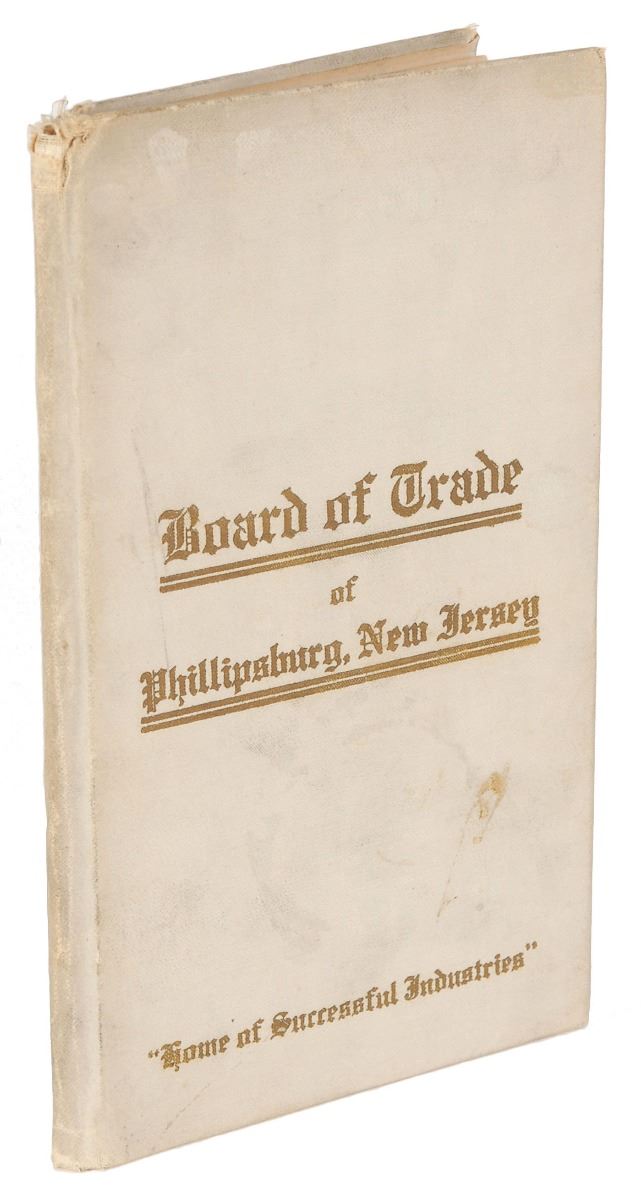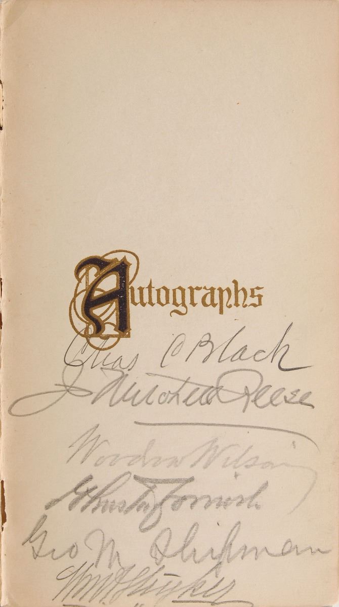 Hardcover program for the first annual banquet of the Board of Trade of Phillipsburg, New Jersey, on April 27, 1911, 4.25 x 8, signed on a special autograph page in pencil by Wilson and several other attendees. In very good condition, with light toning and soiling to inner pages, which are detached from the heavily soiled covers.