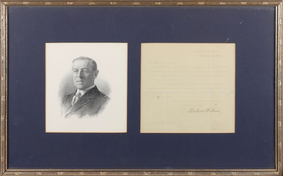TLS, one page, 7 x 7, December 21, 1903. Written from Princeton, New Jersey, a letter to Palmer C. Ricketts, in full: “I need not tell you how much I appreciate the invitation to speak at the dinner of your Alumni association in New York on the 5 Feb., but I am sorry to say that a previous engagement prevents. I am denying myself as many of these engagements as possible this year on account of an extraordinary accumulation of work at home, but it happens that one of my engagements falls on the evening of Feb. 5.” Matted and framed with an engraving of Wilson to an overall size of 20.75 x 13.75. In very good to fine condition, with all of the type faded by readable.