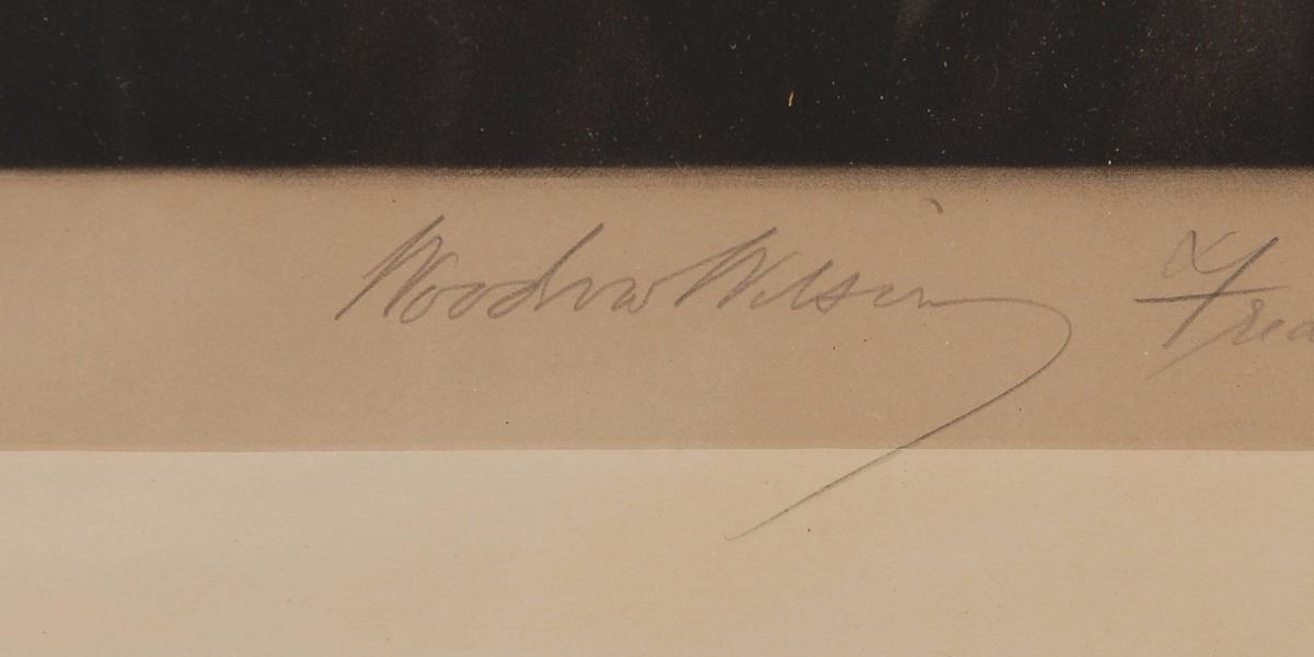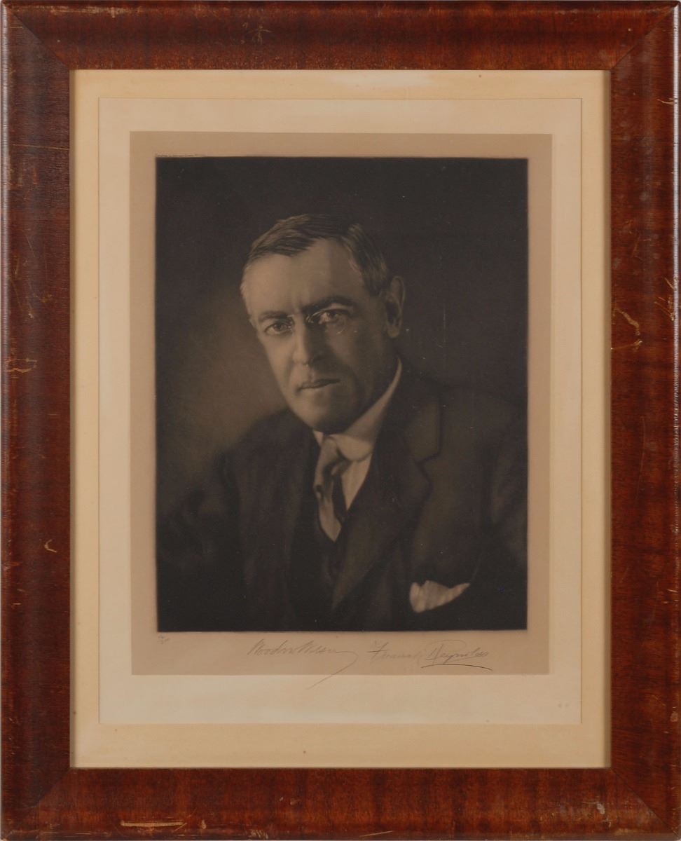 Limited edition vintage matte-finish 14 x 18 photo of an artistic portrait of Woodrow Wilson by artist Frederick Reynolds, numbered 46/300, signed in pencil in the lower border by Wilson and by the artist. Archivally matted and framed to an overall size of 19.5 x 24. In fine condition.