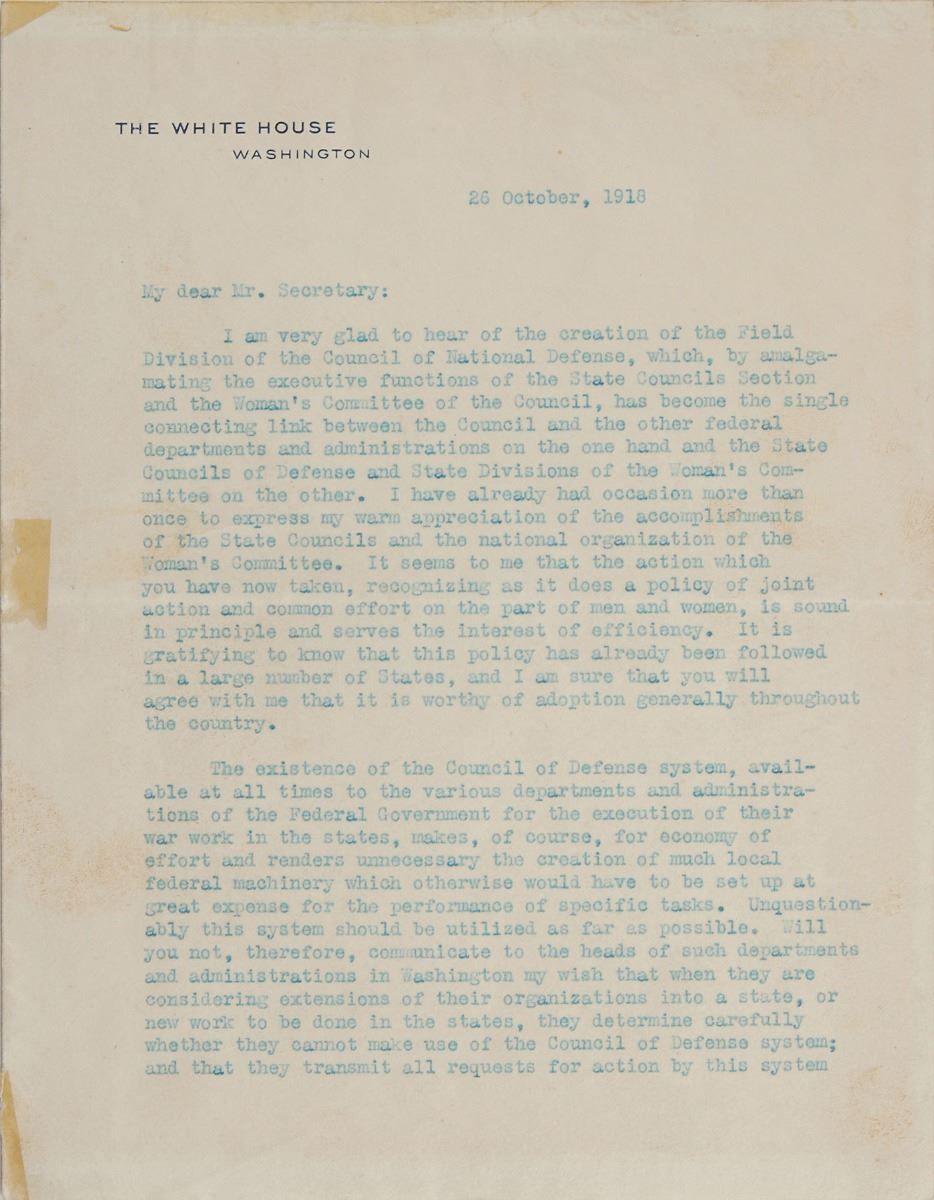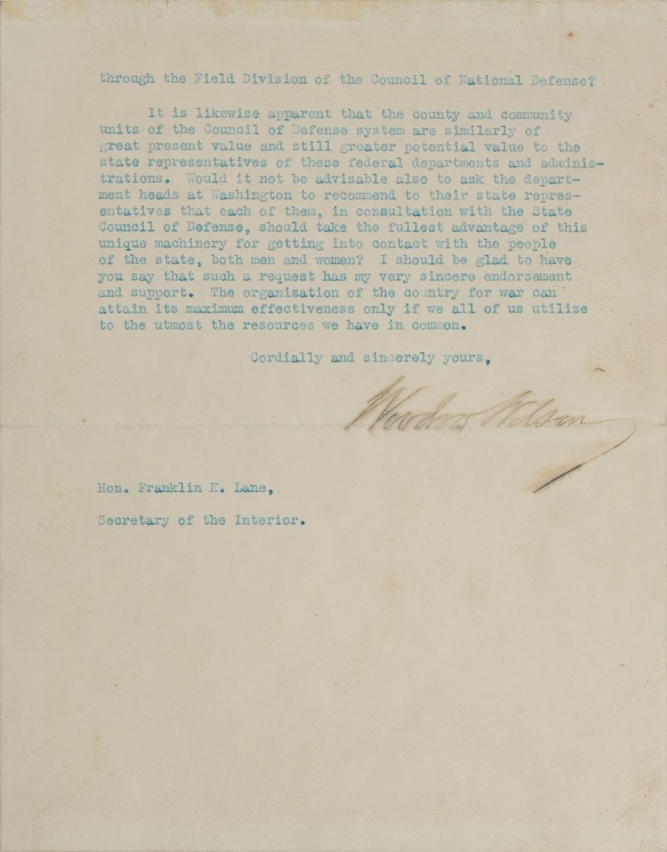 TLS as president, two pages on two adjoining sheets, 7 x 8.75, White House letterhead, October 26, 1918. Letter to Franklin K. Lane, the Secretary of the Interior, in part: "I am very glad to hear of the creation of the Field Division of the Council of National Defense, which, by amalgamating the executive functions of the State Councils Section and the Woman's Committee of the Council, has become the single connecting link between the Council and the other federal departments and administration on the one hand and the State Councils of Defense and State Divisions of the Woman's Committee on the other…The existence of the Council of Defense system, available at all times to the various departments and administrations of the Federal Government for the execution of their war work in the states, makes, of course, for economy of effort and renders unnecessary the creation of much local federal machinery which otherwise would have to be set up at great expense for the performance of specific tasks…Would it not be advisable also to ask the department heads at Washington to recommend to the state representatives that each of them, in consultation with the State Council of defense, should take the fullest advantage of this unique machinery for getting into contact with the people of the state, both men and women?" In very good condition, with light toning and soiling, old tape to the left edge of the first page, and light blurring to Wilson's signature. Pre-certified PSA/DNA.