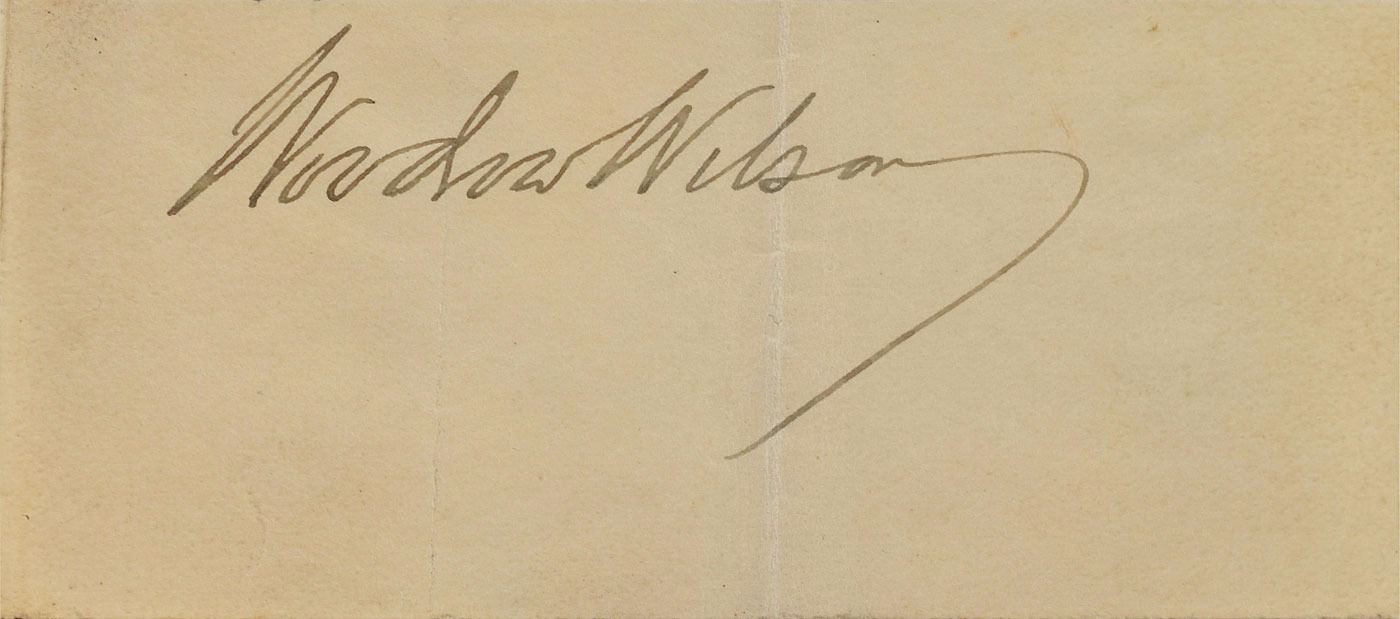 Ink signature, "Woodrow Wilson,” on an off-white 3.75 x 1.75 slip. In very good to fine condition, with light creasing and a central vertical fold. Accompanied by a partly-printed invitation to a reception at The White House on February 24, 1914, and the original envelope with embossed seal on reverse flap.