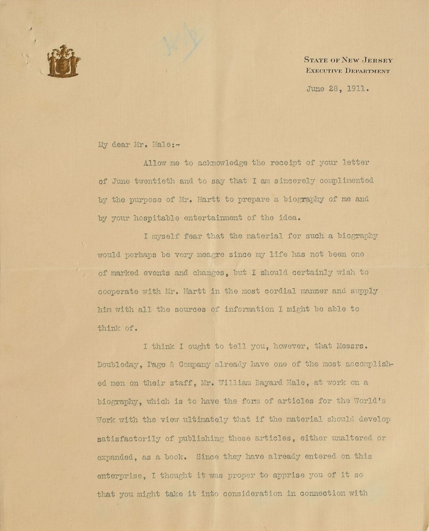 TLS, two pages, 7.75 x 9.75, State of New Jersey, Executive Department letterhead, June 28, 1911. Letter to R. T. Hale, in part: "I am sincerely complimented by the purpose of Mr. Hartt to prepare a biography of me and by your hospitable entertainment of the idea. I myself fear that the material for such a biography would perhaps be very meagre since my life has not been one of marked events and changes, but I should certainly wish to cooperate with Mr. Hartt in the most cordial manner and supply him with all the sources of information I might be able to think of. I think I ought to tell you, however, that Messrs. Doubleday, Page & Company already have one of the most accomplished men on their staff, Mr. William Bayard Hale, at work on a biography." In fine condition, with staple holes to the upper left, and a light block of toning.