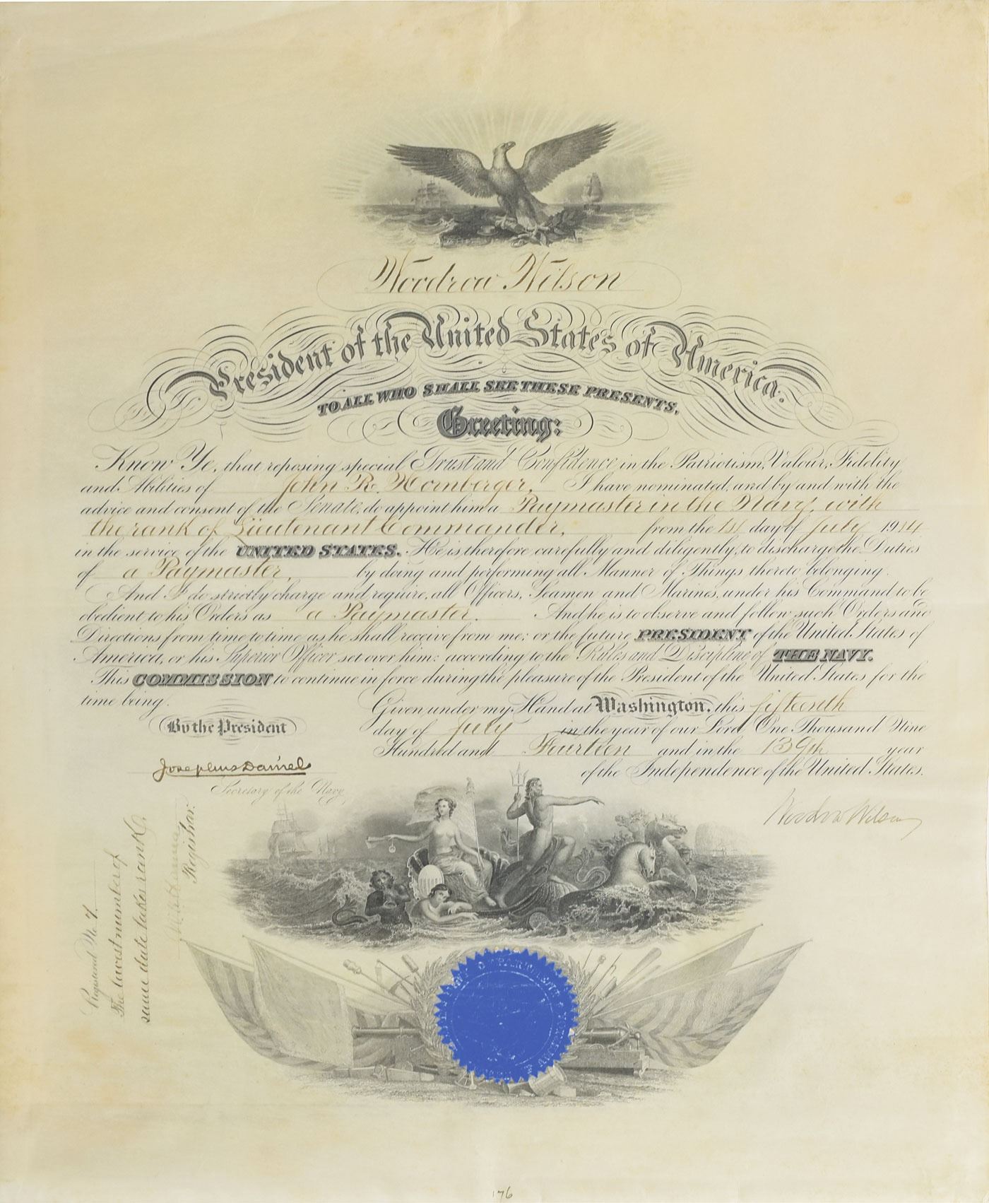 Partly-printed vellum DS as president, one page, 15.75 x 19.75, July 15, 1914. President Wilson appoints John R. Hornberger as "Paymaster in the Navy, with the rank of Lieutenant Commander." Signed at the conclusion by Wilson, and countersigned by Secretary of the Navy Josephus Daniels. Blue Navy Department seal remains affixed to lower vignette. In fine condition.