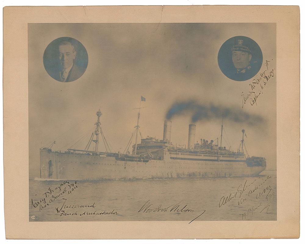 Superb vintage matte-finish 13.75 x 11 photo of the USS George Washington, with small portraits of Woodrow Wilson and Captain Edward McCauley in the upper corners, signed in fountain pen, "Woodrow Wilson," "Cary T. Grayson, Rear Admiral, M.C. U.S.N.," "Edward McCauley, Jr., Captain, U.S. Navy," "Albert Gleaves, Vice Admiral, USN, 19 April 1919," and "[Jules J.] Jusserand, French Ambassador." In very good to fine condition, with three repaired tears to the top border. An exceptional piece associated with the close of World War I.