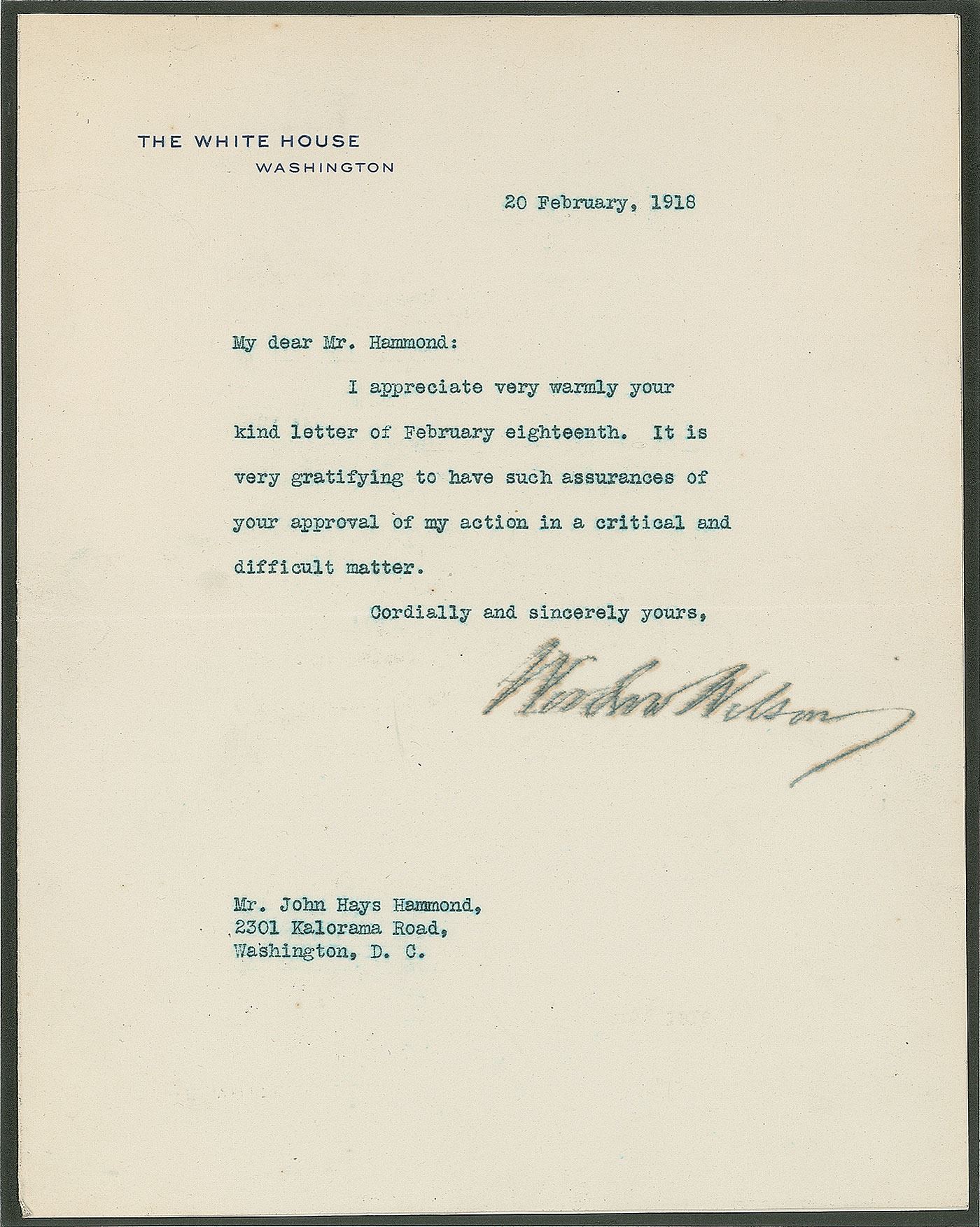 World War I-dated TLS as president, one page, 7 x 8.75, White House letterhead, February 20, 1918. Letter to John Hays Hammond, in full: "I appreciate very warmly your kind letter of February eighteenth. It is very gratifying to have such assurances of your approval of my action in a critical and difficult matter." Letter is affixed to a slightly larger black sheet. In fine condition, with brushing and blotting to the signature. Wilson had delivered his Fourteen Points speech to Congress the month before writing this letter and was then working to establish the League of Nations.