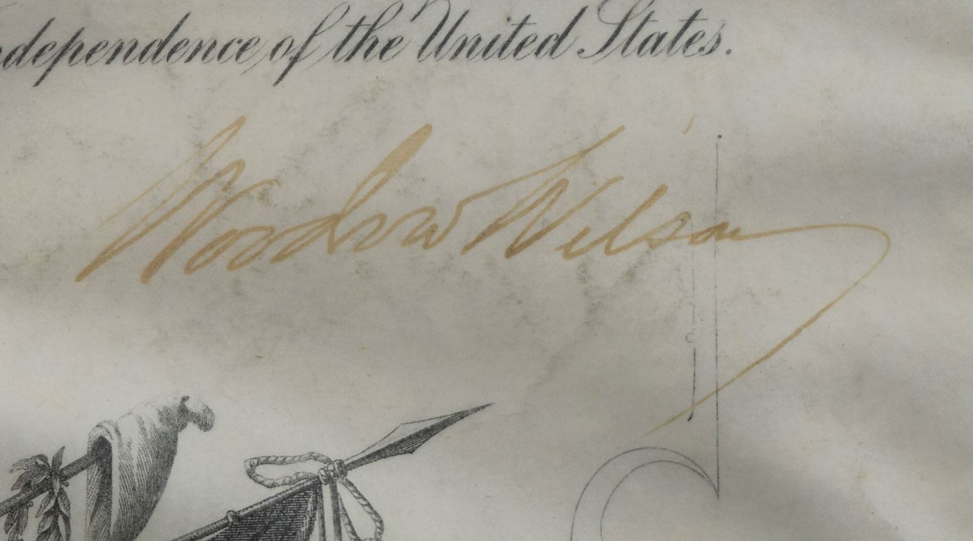 Partly-printed vellum DS as president, one page, 14.5 x 18.5, May 12, 1916. President Wilson appoints Jose Penteado Bill as "First Lieutenant in the Medical Rescue Corps of the Army of the United States." Signed at the conclusion by President Wilson and countersigned by Secretary of War Newton D. Baker. The blue seal affixed to the lower left remains fully intact. Framed to an overall size of 16.5 x 20.5. In very good condition, with heavy overall waviness and rippling, light soiling, and Wilson's signature a few shades light.